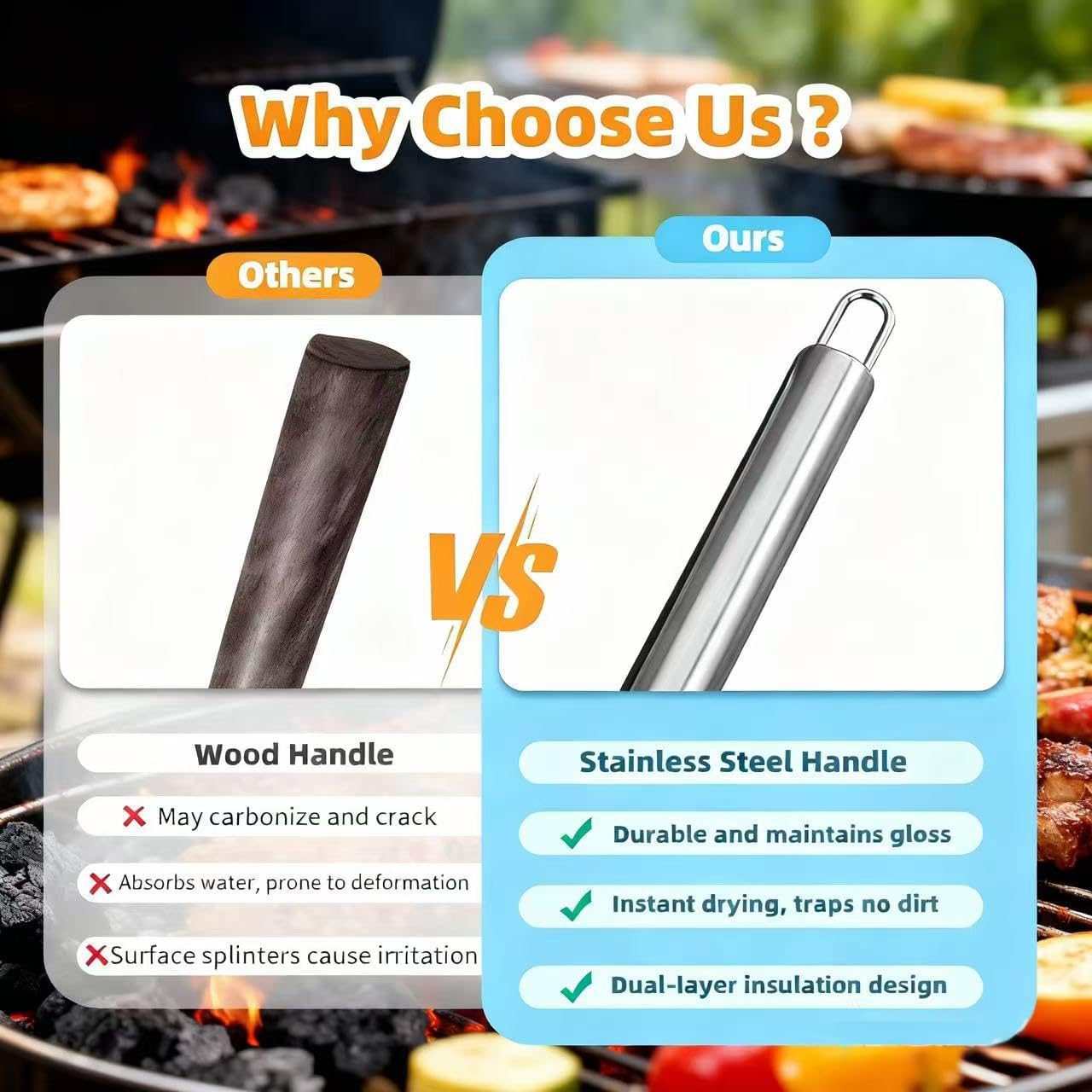 The thickened long handle provides a comfortable grip.Each tool is equipped with a convenient hanging loop for easy hanging on the grill or wall storage.