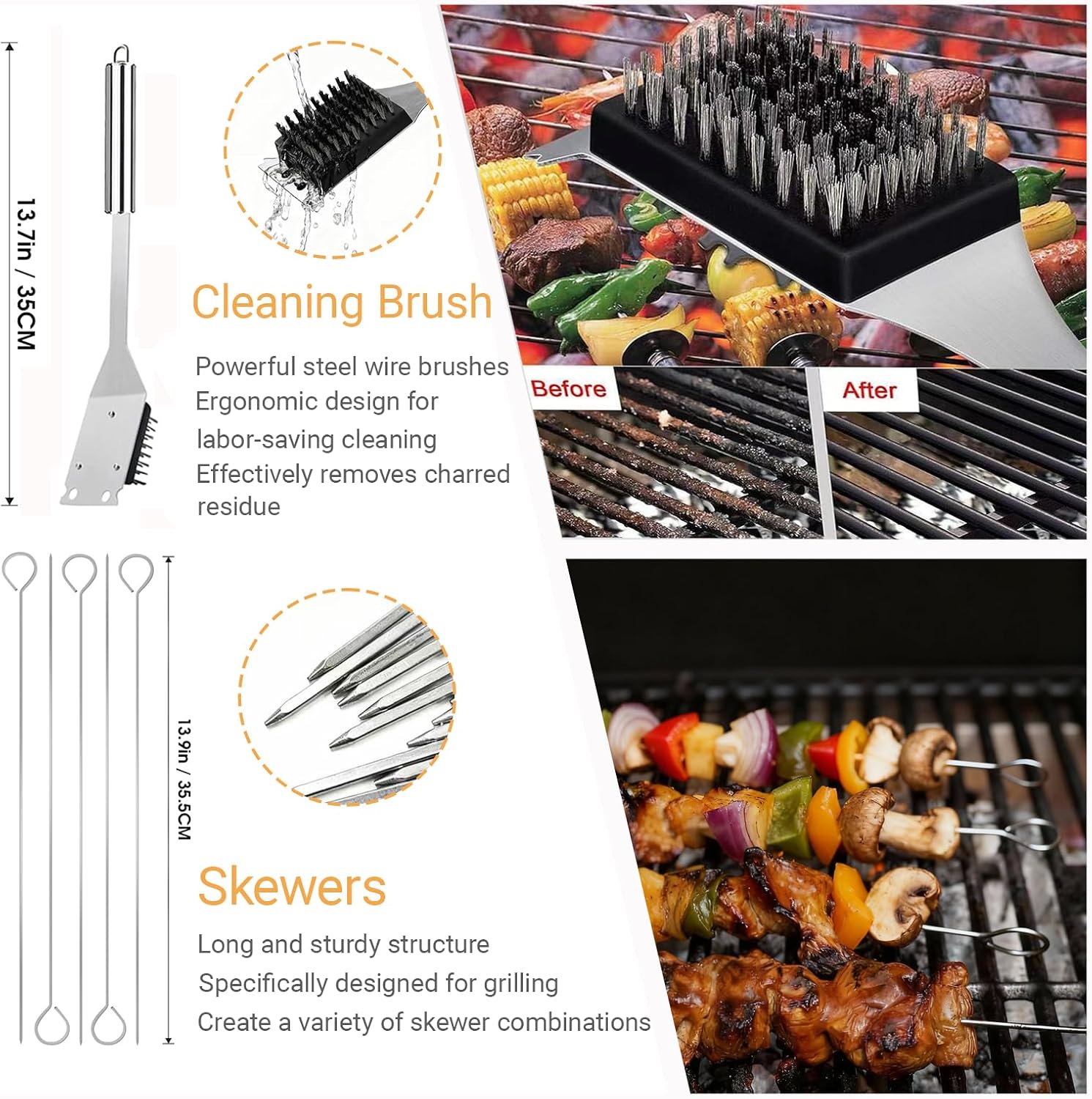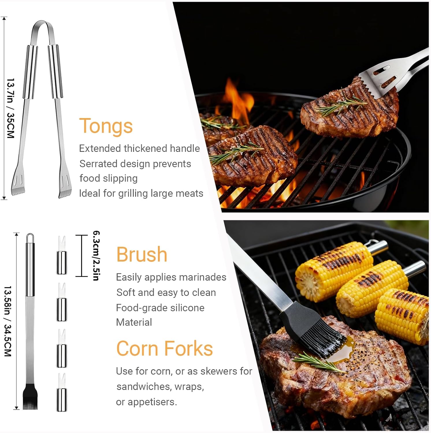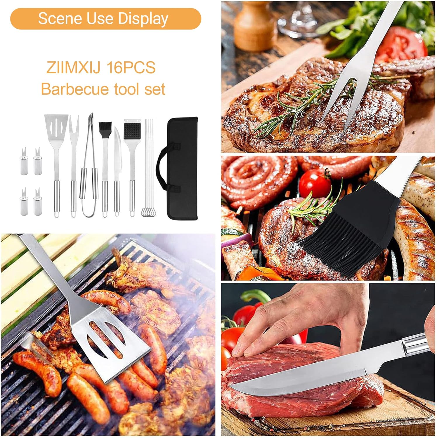 Complete BBQ Utensil Set for Every Grilling Need: Master any recipe with this comprehensive kit featuring. 16 pieces of grill accessories tools include: 1*Tongs, 1*Multi-purpose spatula, 1*Grill fork, 1*knife, 1*Cleaning brush, 1*Silicone basting brush, 4*Corn holders, 5*BBQ skewers, 1* Carrying bag. Whether you are flipping burgers or searing steaks, these versatile bbq accessories provide the control and precision required by grill masters