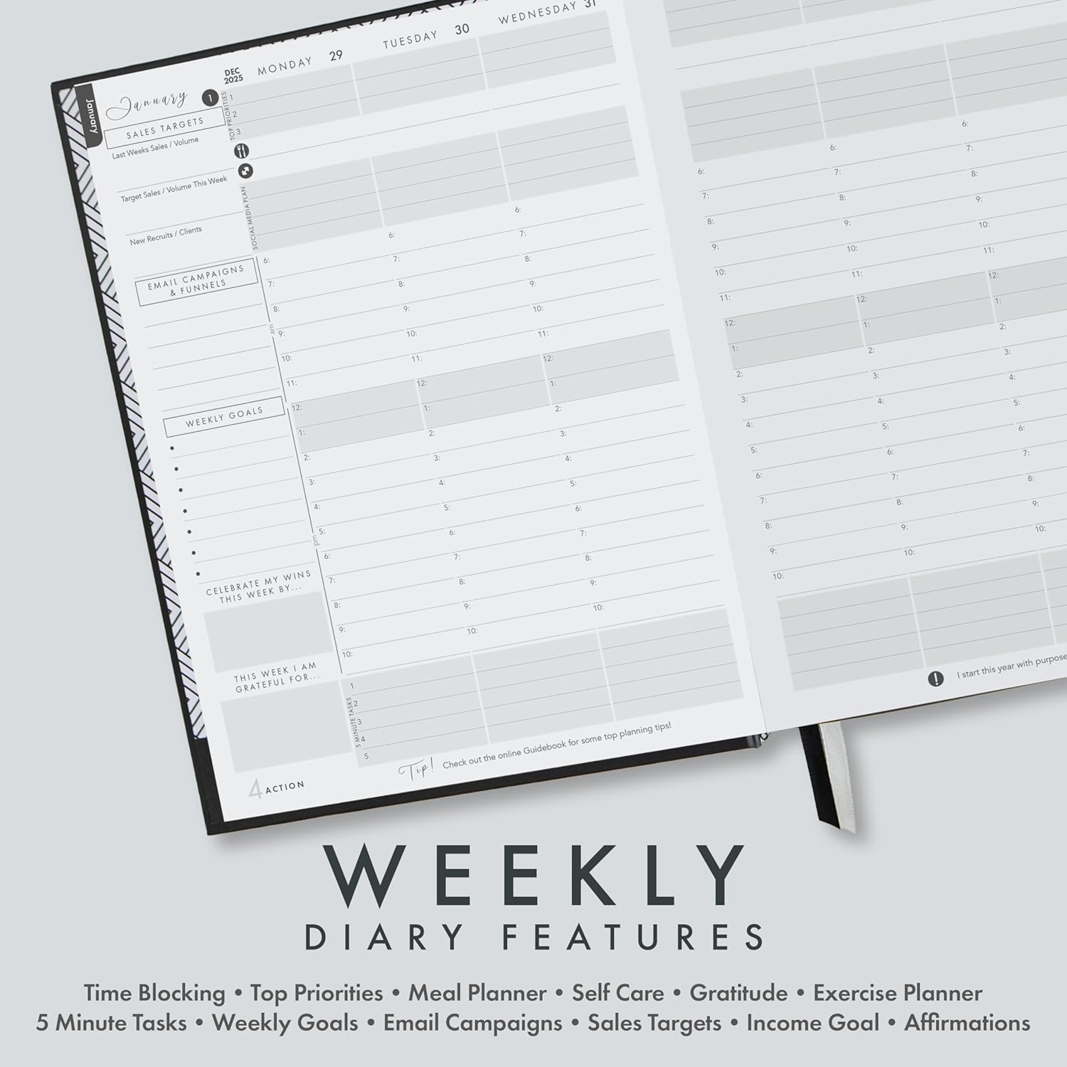 Yes. Week-to-view spreads are spacious for time-blocking. Includes add KPI pages, financial planner, social media planning and stats trackers as well as goals, habits, routines and a month review – and much more.