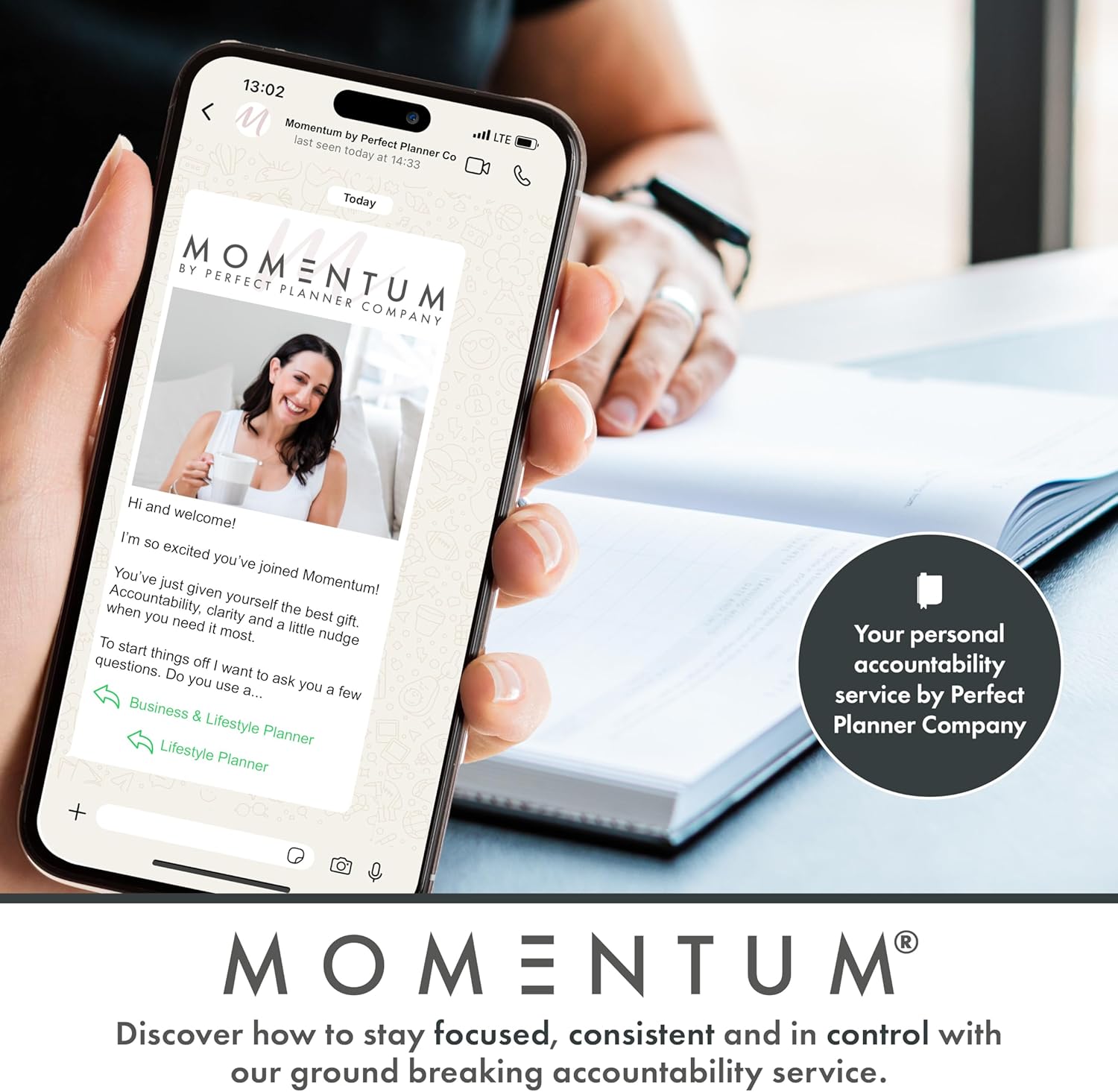 Momentum is an optional accountability add-on that sends gentle reminders, tips and prompts to your phone, helping you use your planner consistently and stay on track all year.