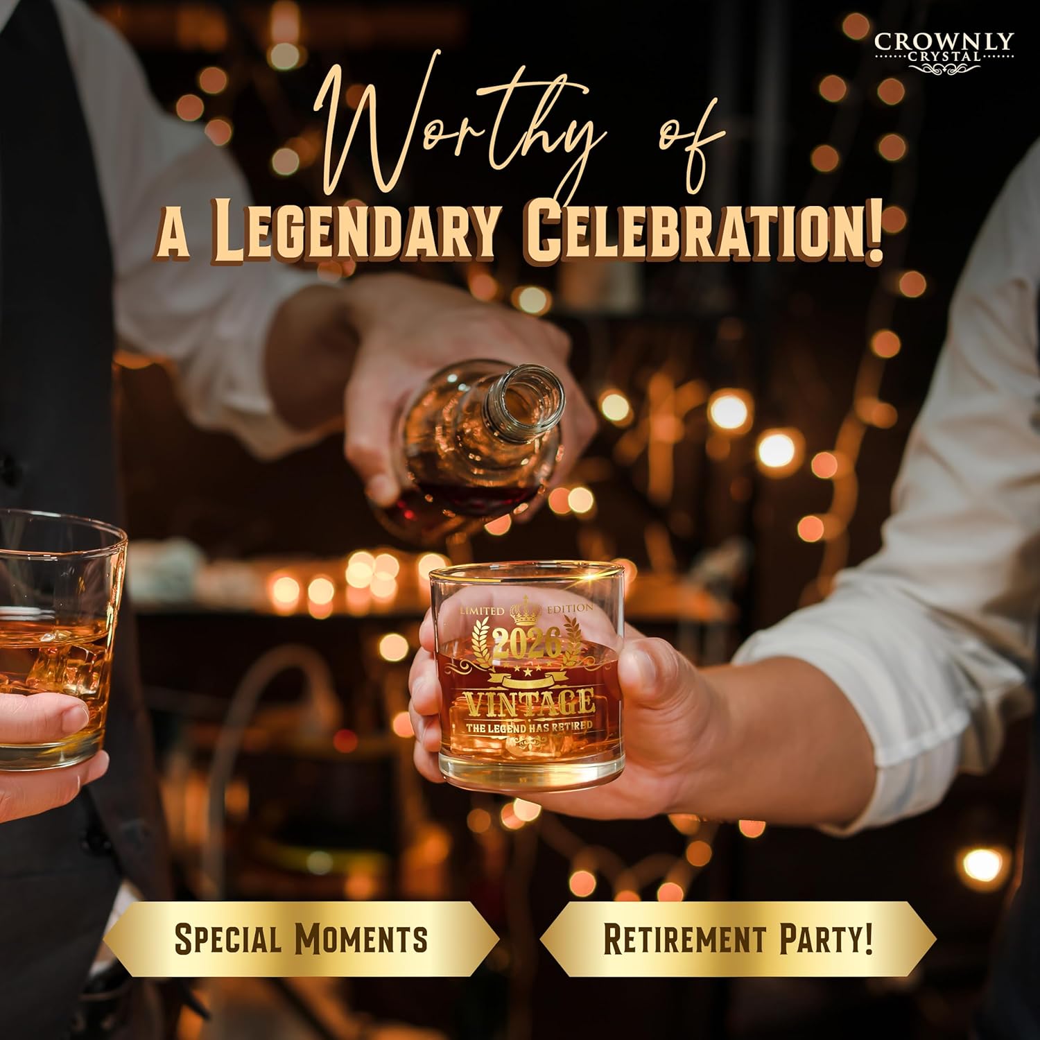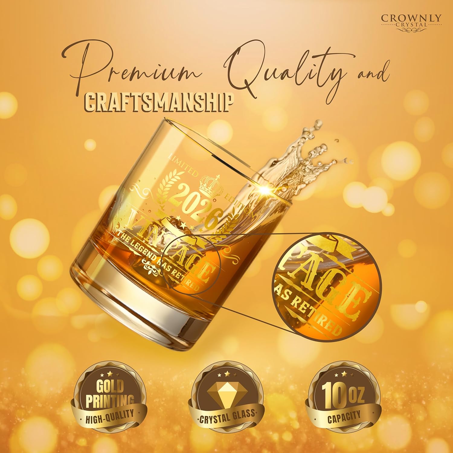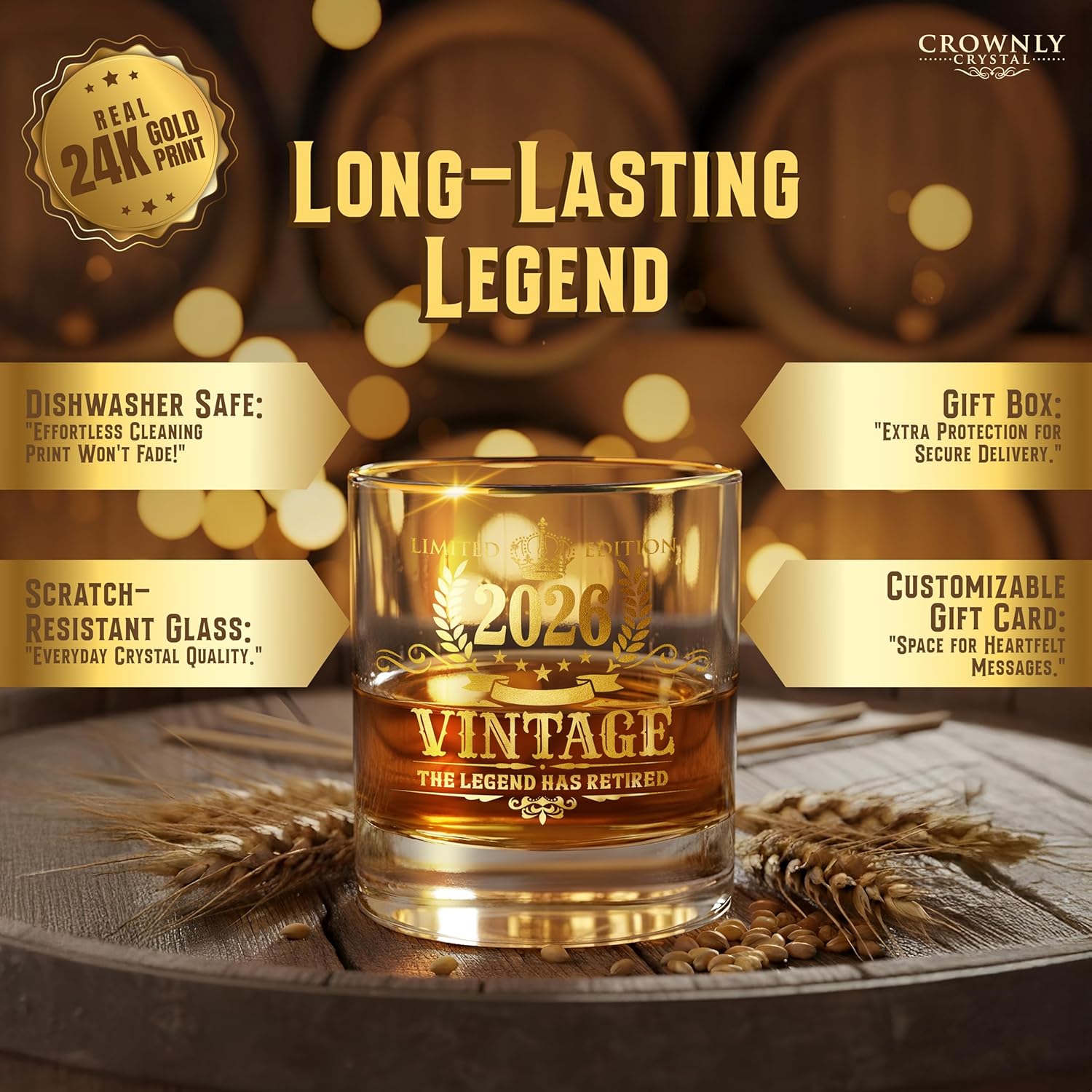 PRINT QUALITY: Crystal whiskey glass with words “LIMITED EDITION 2026 VINTAGE THE LEGEND HAS RETIRED” will never fade or lose, Unlike others, the text is printed on the glass appearance which is easy to wash out. Ours will be kept long time and used for many years in daily life. To maintain words bright, it is better to wash by hands.