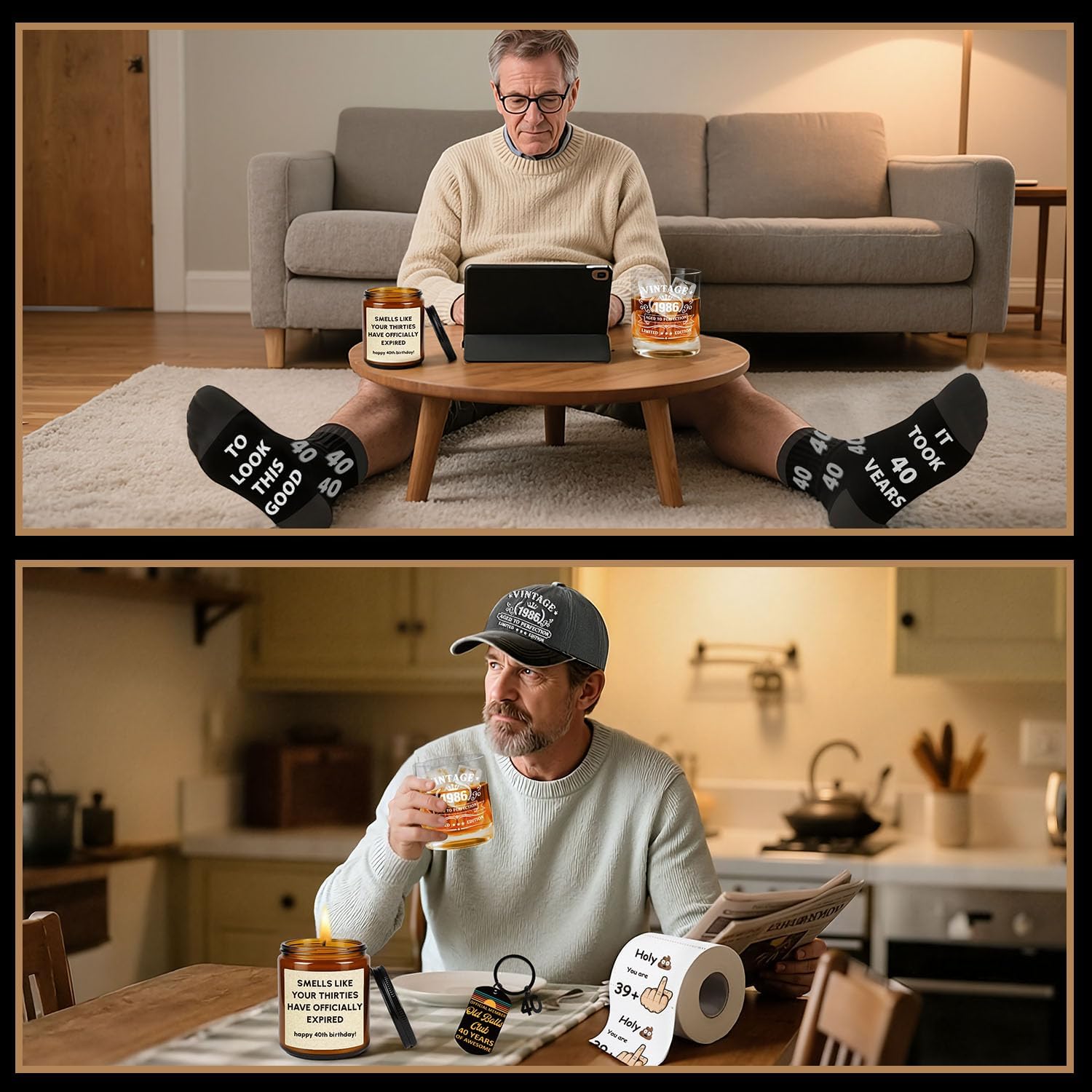 🎁【Complete Premium Gift Box】Packed with personality and practicality, this set includes a vintage 1986 whiskey glass, a stylish baseball hat, a scented candle, a pair of cozy socks, a positive keychain, and a hilarious toilet roll. All items are beautifully arranged in a ready-to-gift box for an instant “wow” moment.