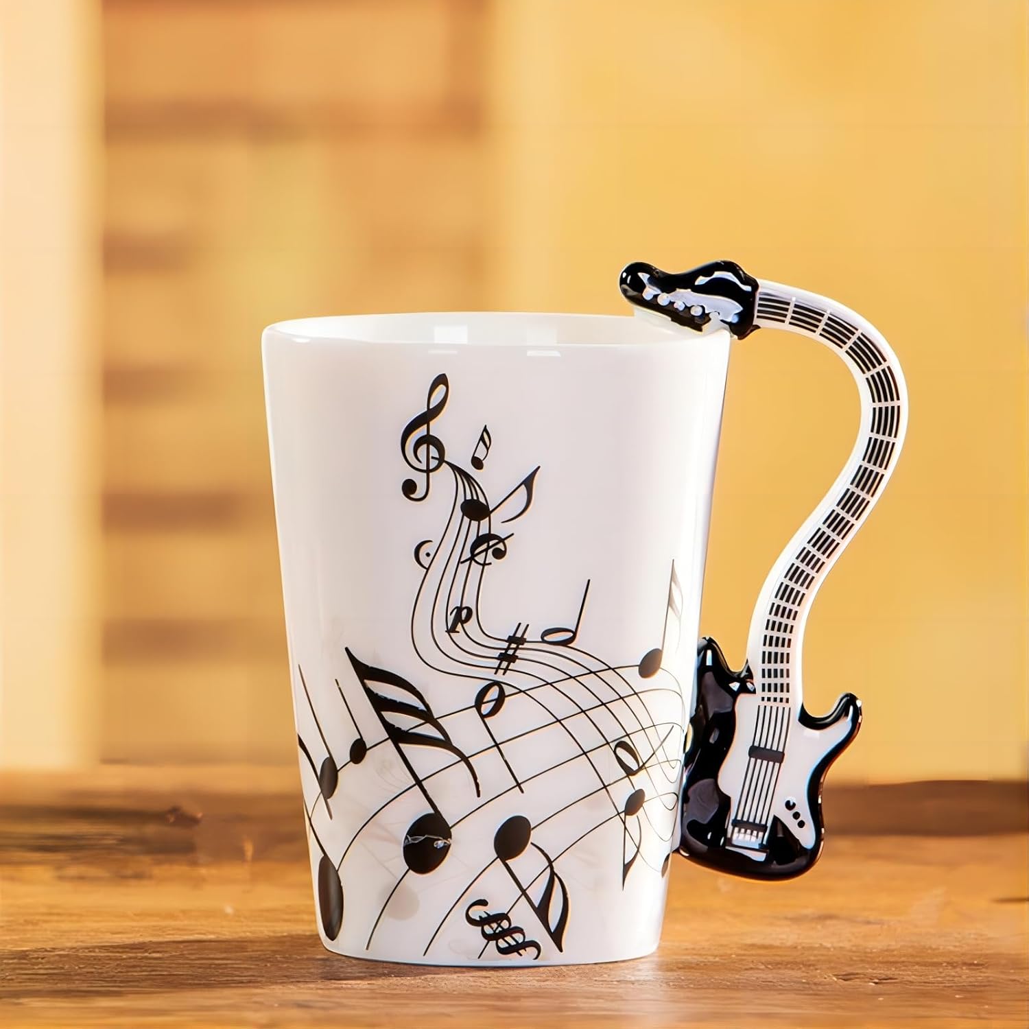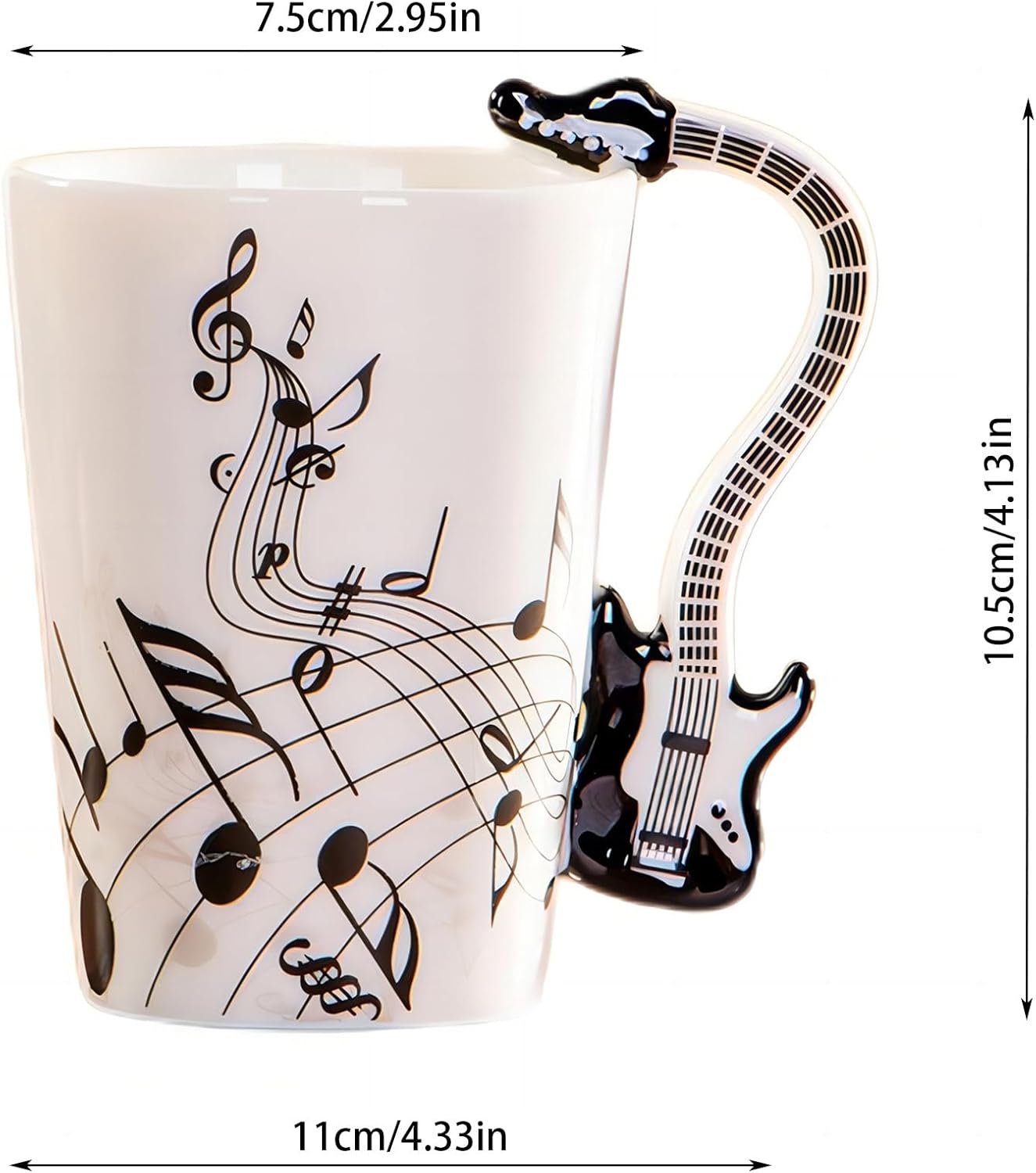 A super funky rock and roll guitar coffee mug, very cute fun design and unique art musical notes coffee mug.