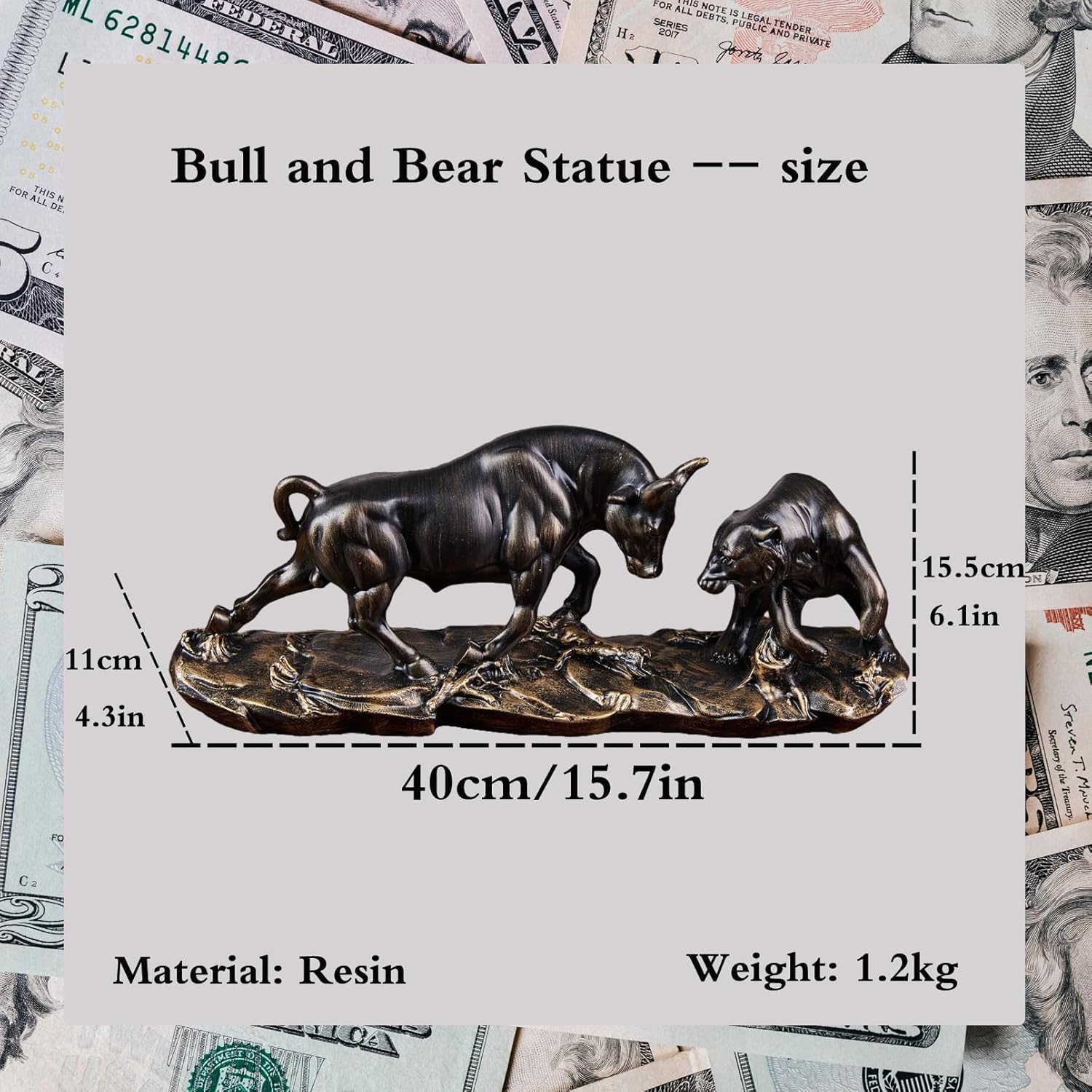 1.Bull and Bear Statue: The deco figures gold Bull & Bear stock market statues are 40cm x 10cm x 15.5cm (15.75 inch x 3.94 inch x 6.10 inch) and weigh 1.2kg. They are made of high quality resin and have finely crafted details that give them an elegant and luxurious look.