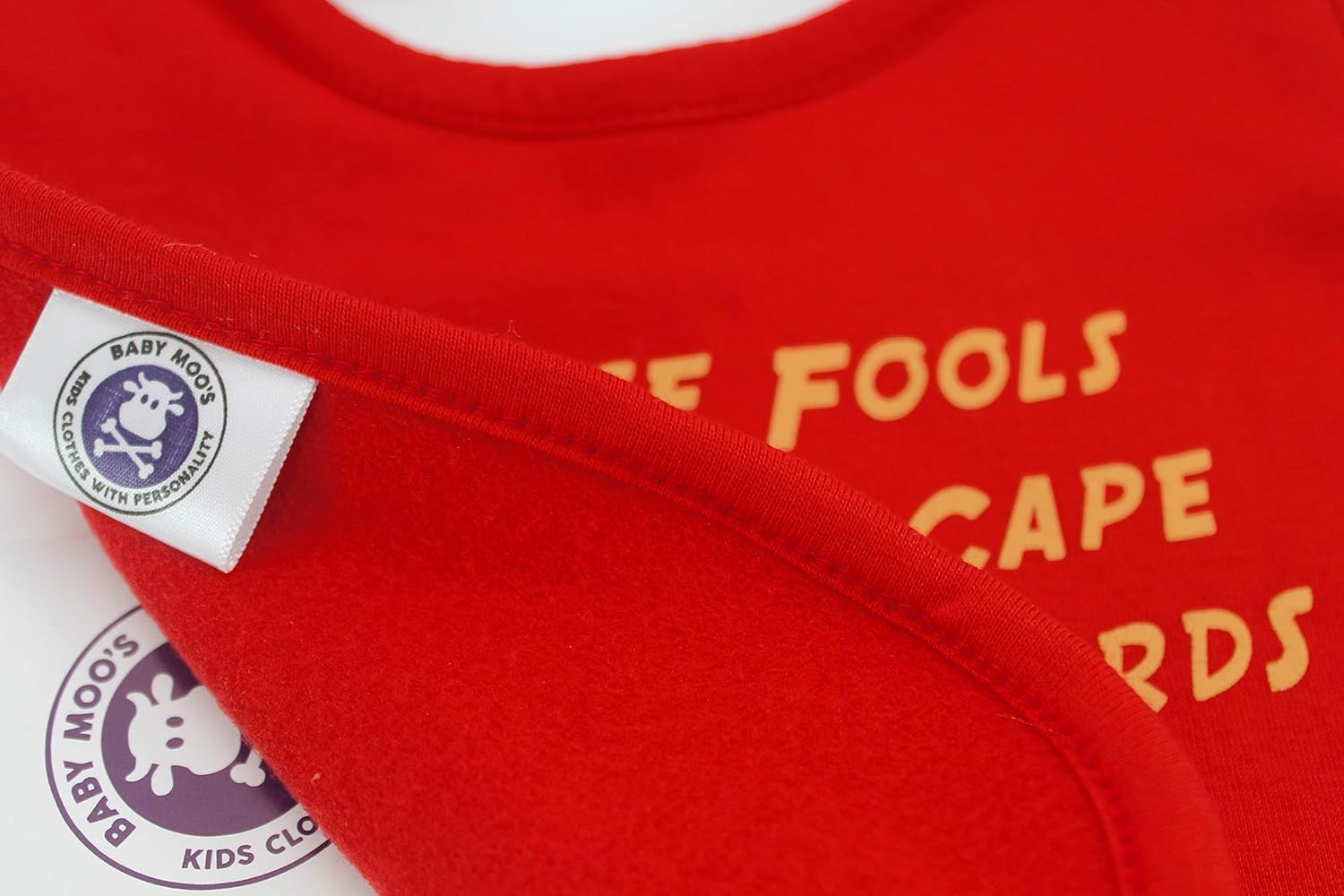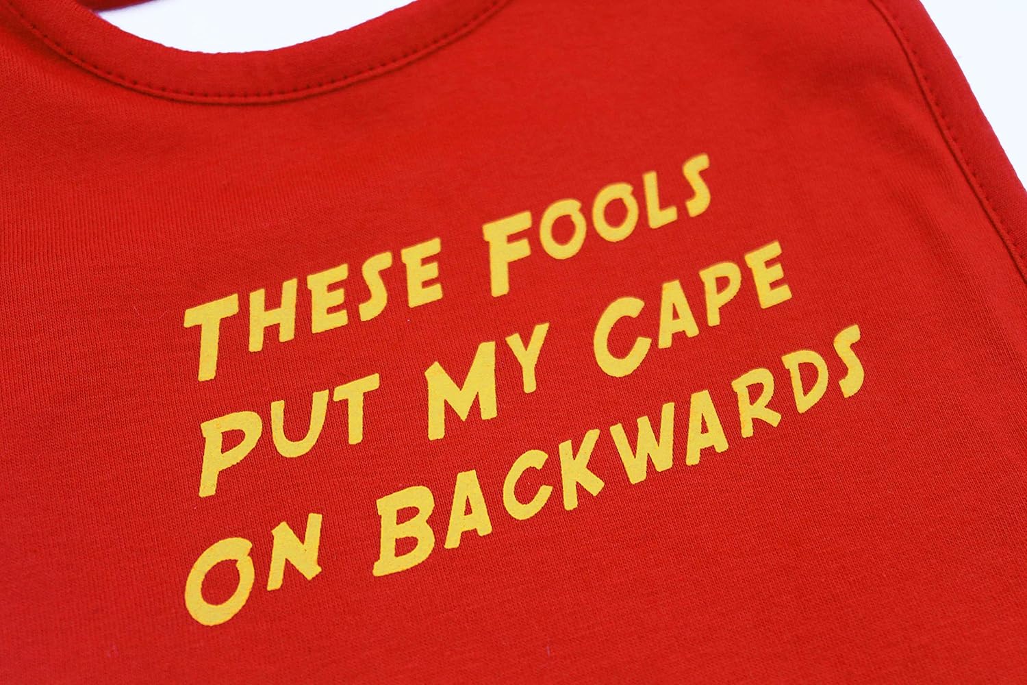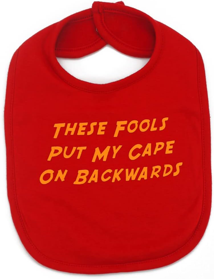 Our perfectly playful funny baby bibs are designed in the UK & made by our family run independent production partner in Tamil Nadu, ensuring superhero quality.Vibrant absorbent soft cotton front & a naturally moisture repellent fleece back keeping baby’s chest dry & clothing changes at bay.Our bibs come with adjustable size settings, seeing baby through til toddlerhood & keeping your bank balance happy!Our funny baby bibs are individually & professionally printed meaning the print keeps packing a punch wash after wash.Slogan reads; THESE FOOLS PUT MY CAPE ON BACKWARDS