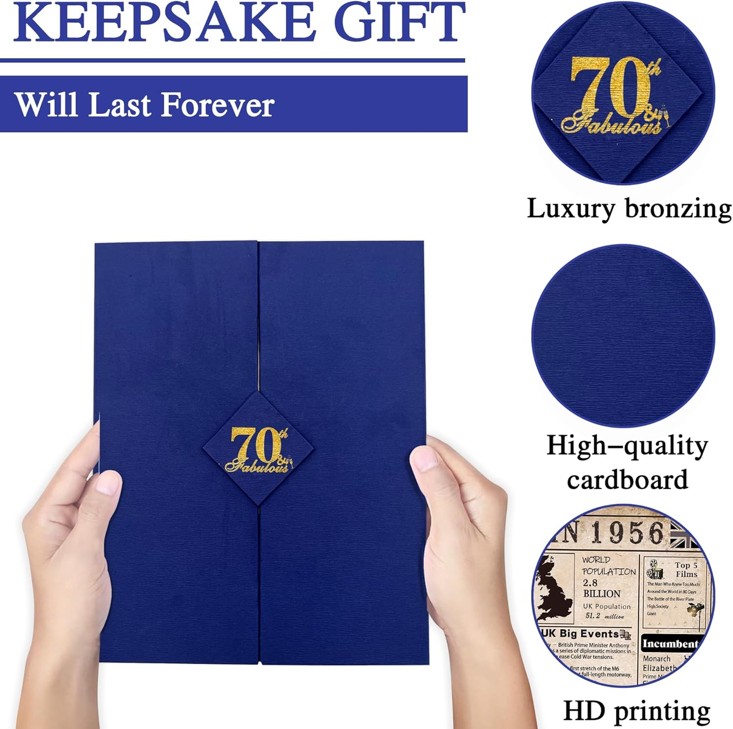 DESIGNED FOR 70-YEAR-OLD EYES: We prioritize clarity. The layout features a classic royal blue and vintage newspaper aesthetic with large, bold typography. He can comfortably read the nostalgic fun facts without straining his eyes, making it a thoughtful and accessible 70th birthday gift for men.