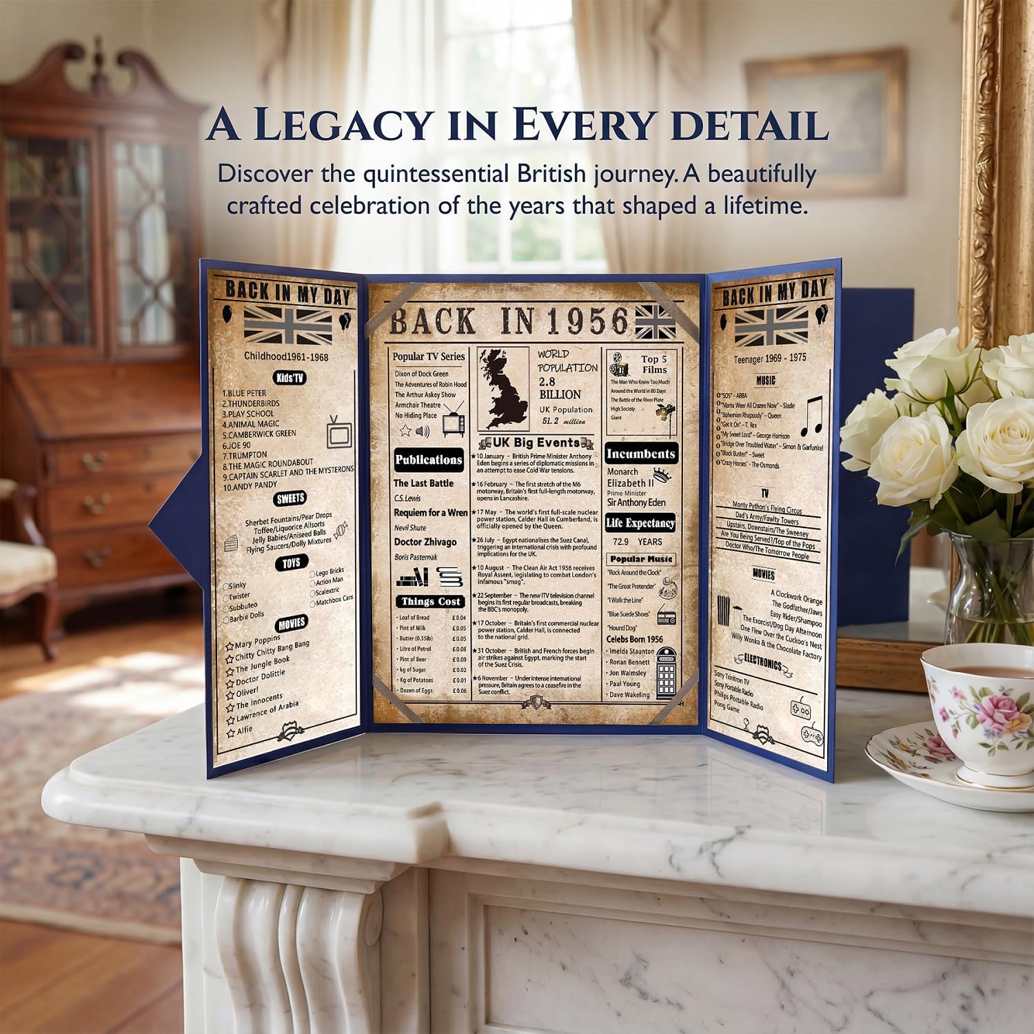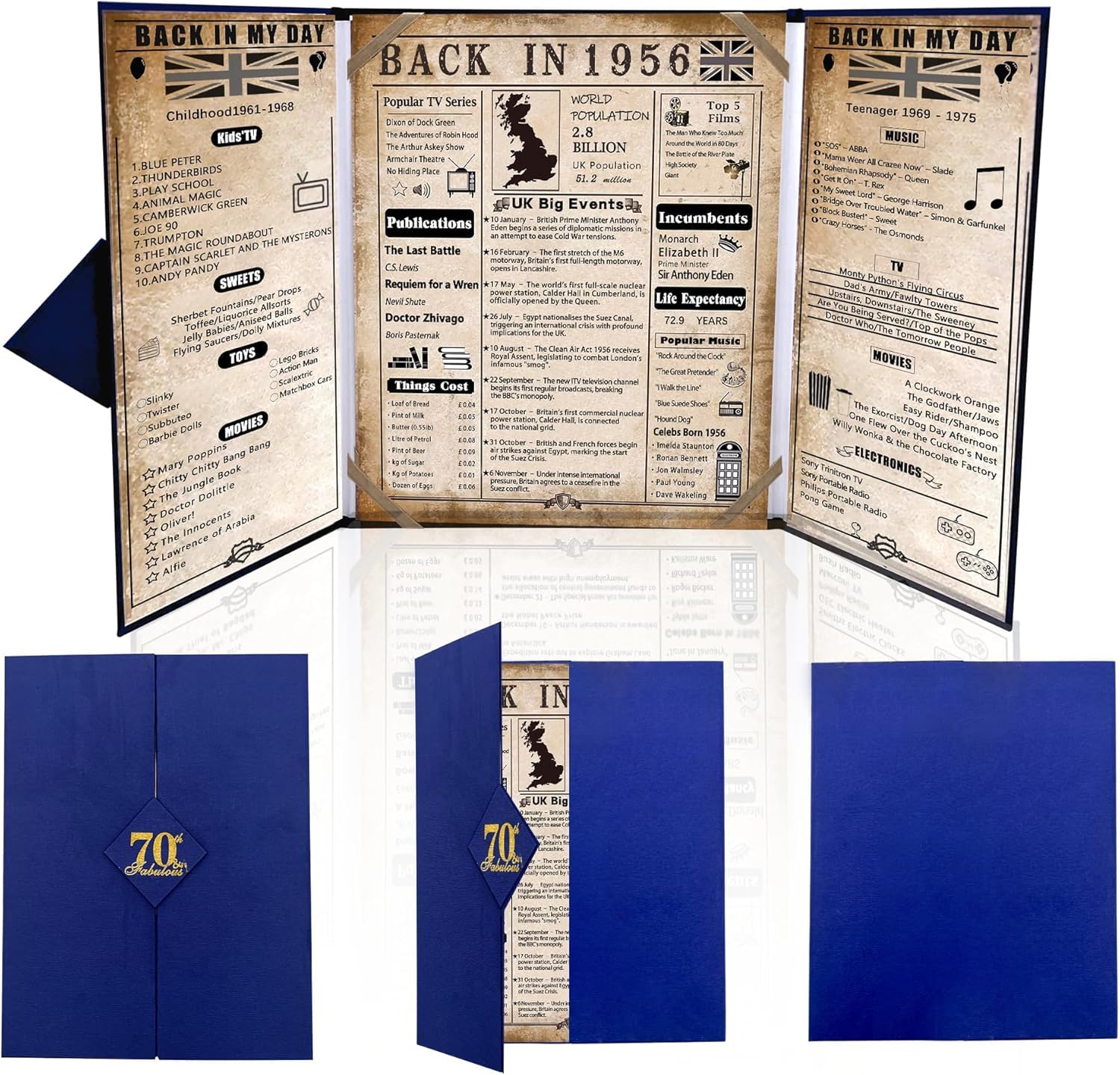 INSTANT DECOR – NO FRAME NEEDED: Unlike rolled-up 1956 posters that struggle to stay flat, our sturdy blue tri-fold board stands independently. Simply unfold it onto the buffet table, cake display, or mantelpiece. It serves as an impressive 70th birthday gifts the moment you take it out of the package.