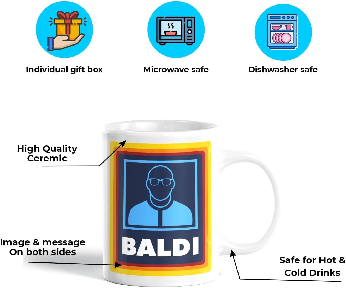 White ceramic mug with 'BALDI' logo featuring a stylized blue human figure on a yellow and red background.White ceramic mug with 'BALDI' logo featuring a stylized blue human figure on a yellow and red background.