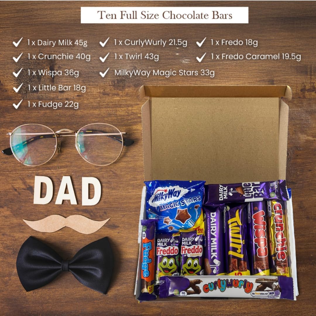 Unique Gifts. The chocolate hamper for men arrives in a sleek white box, small enough to fit through your letter box but large enough to contain 10 chocolate bars! With a special ‘Best Dad’ message inside.