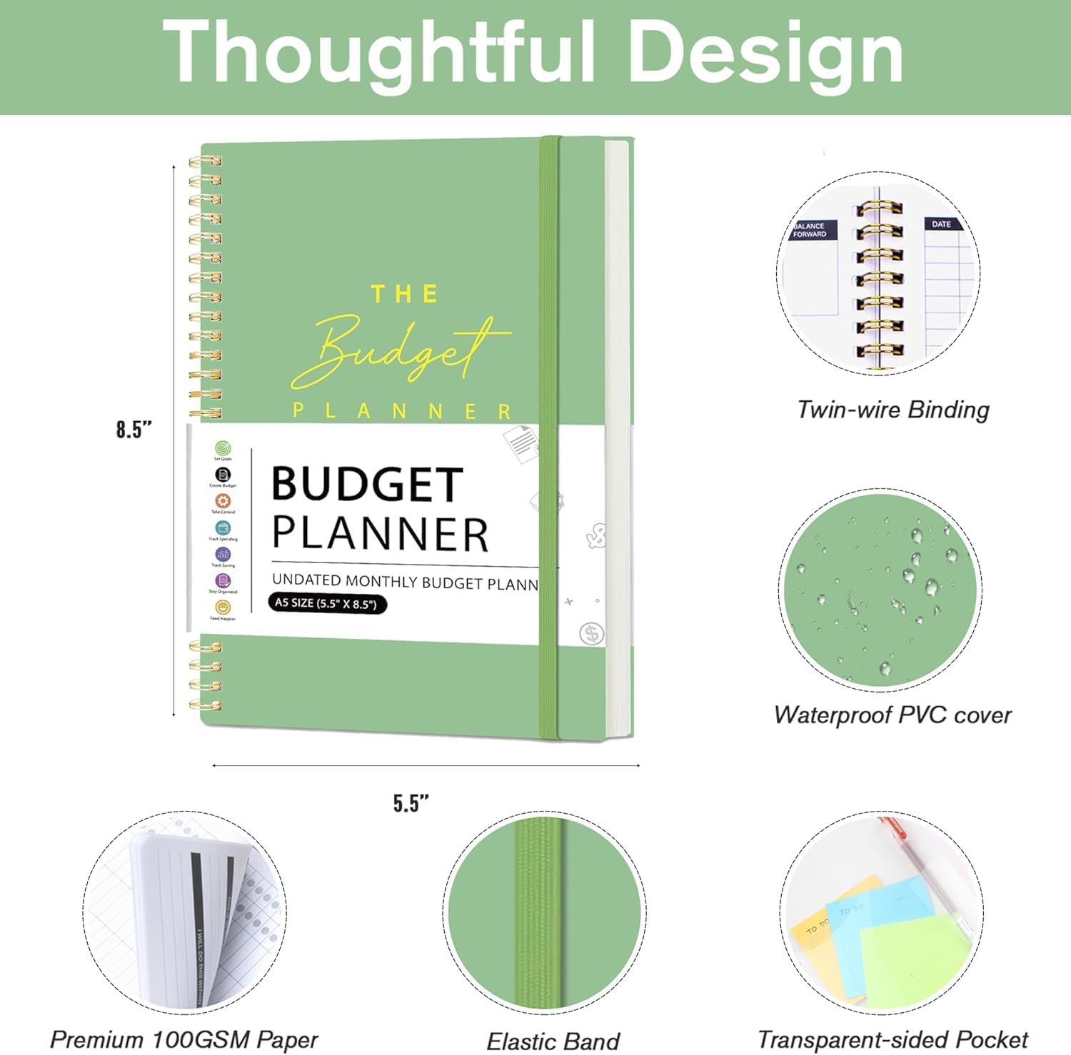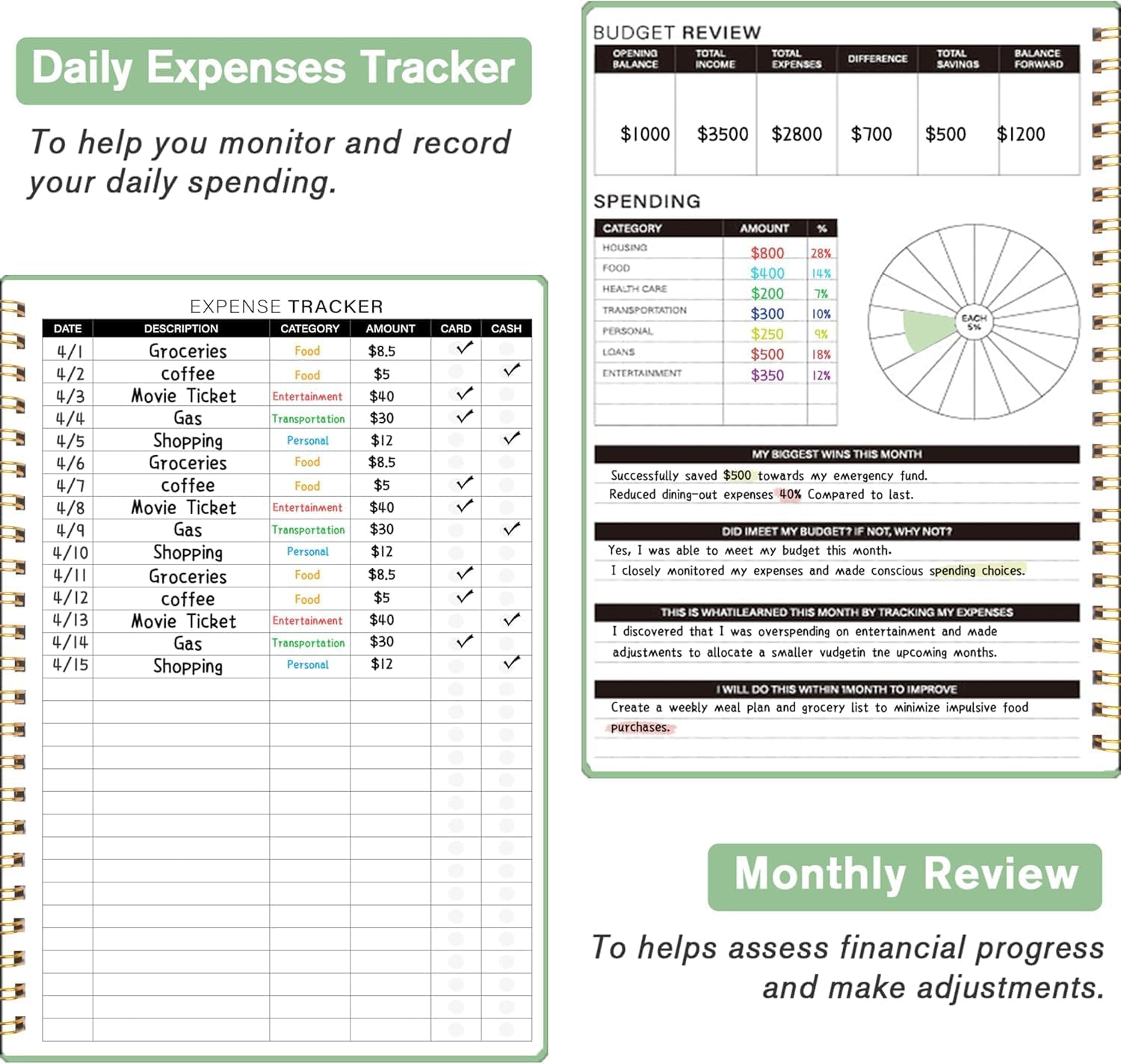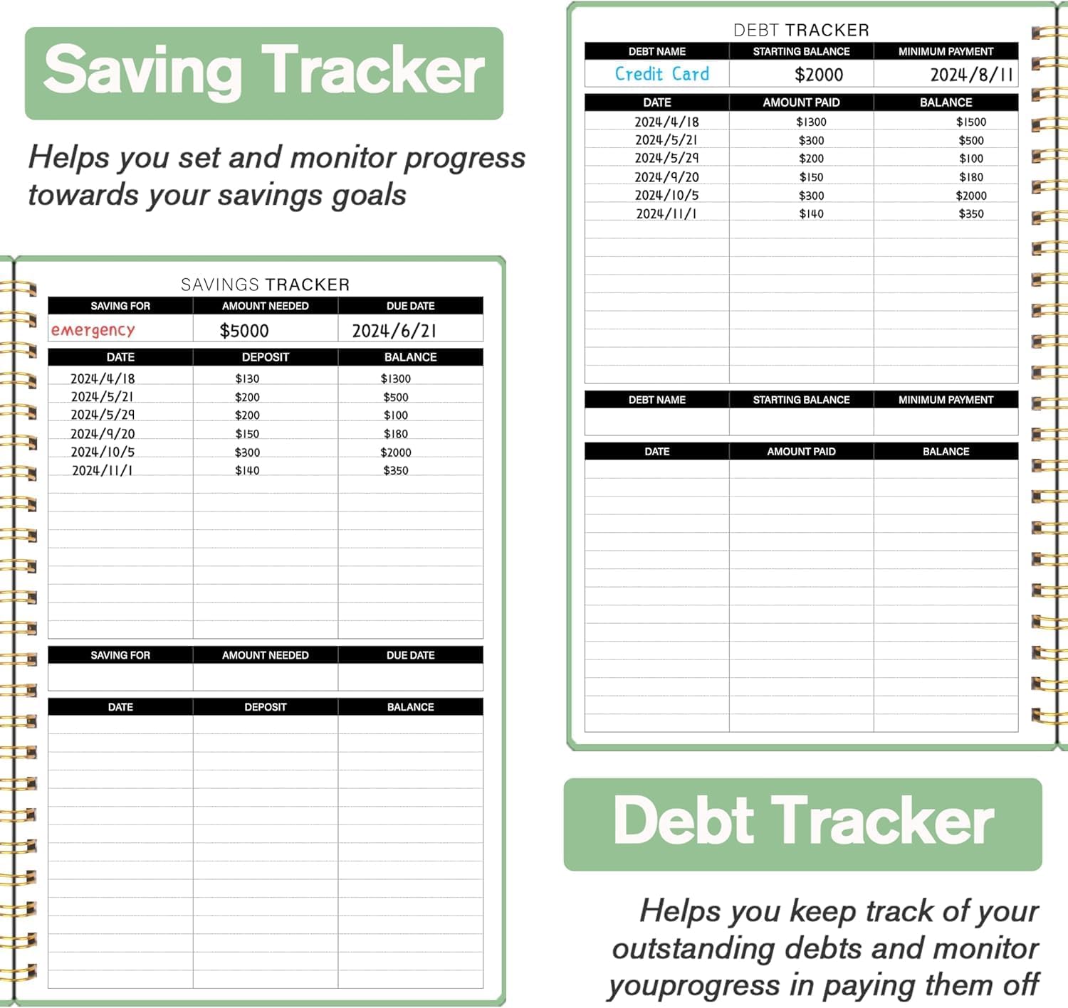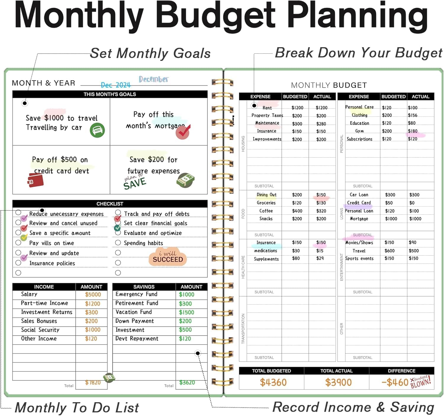 Start Whenever, Wherever: Our budget notebook is undated, allowing you to begin your financial planner journey whenever you’re ready. Compact and conveniently sized at 5.5″ x 8.5″, it easily fits into any bag, ensuring it’s always by your side, ready to guide your financial decisions.