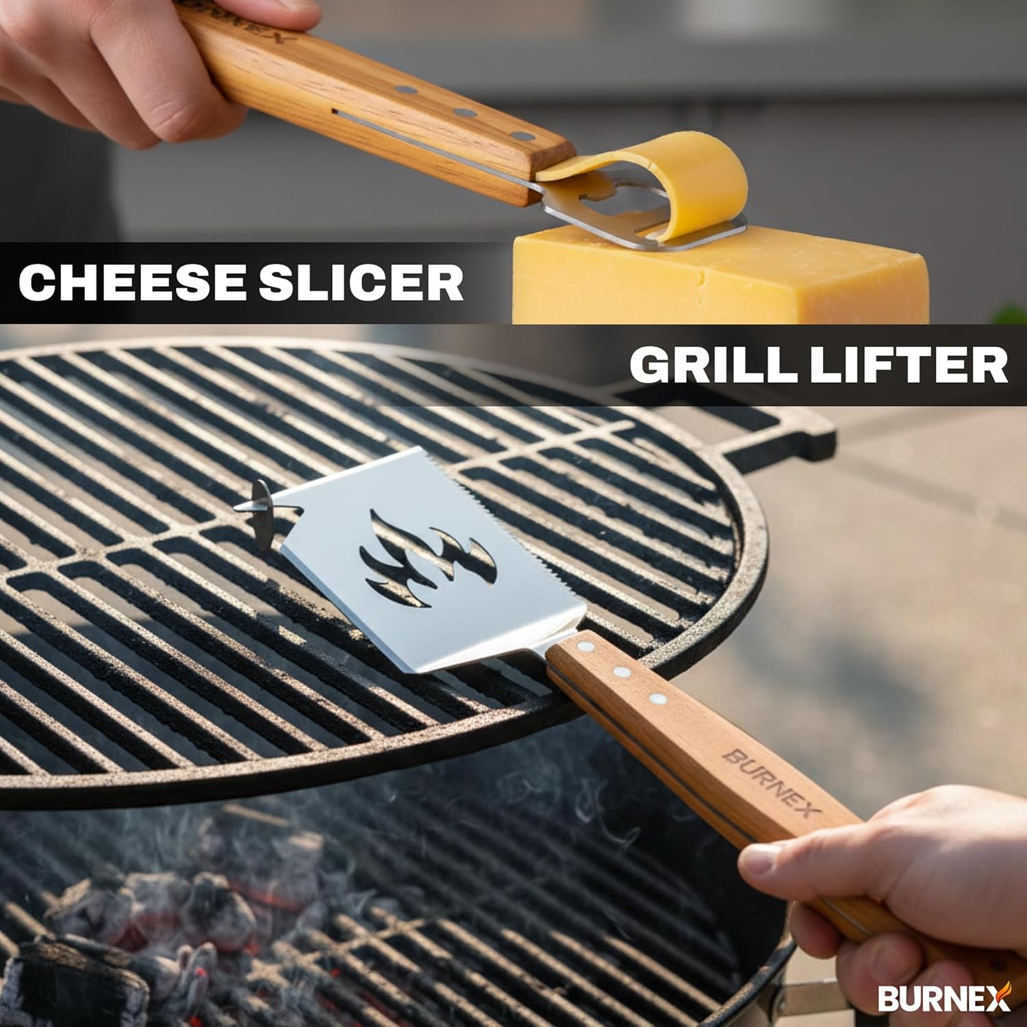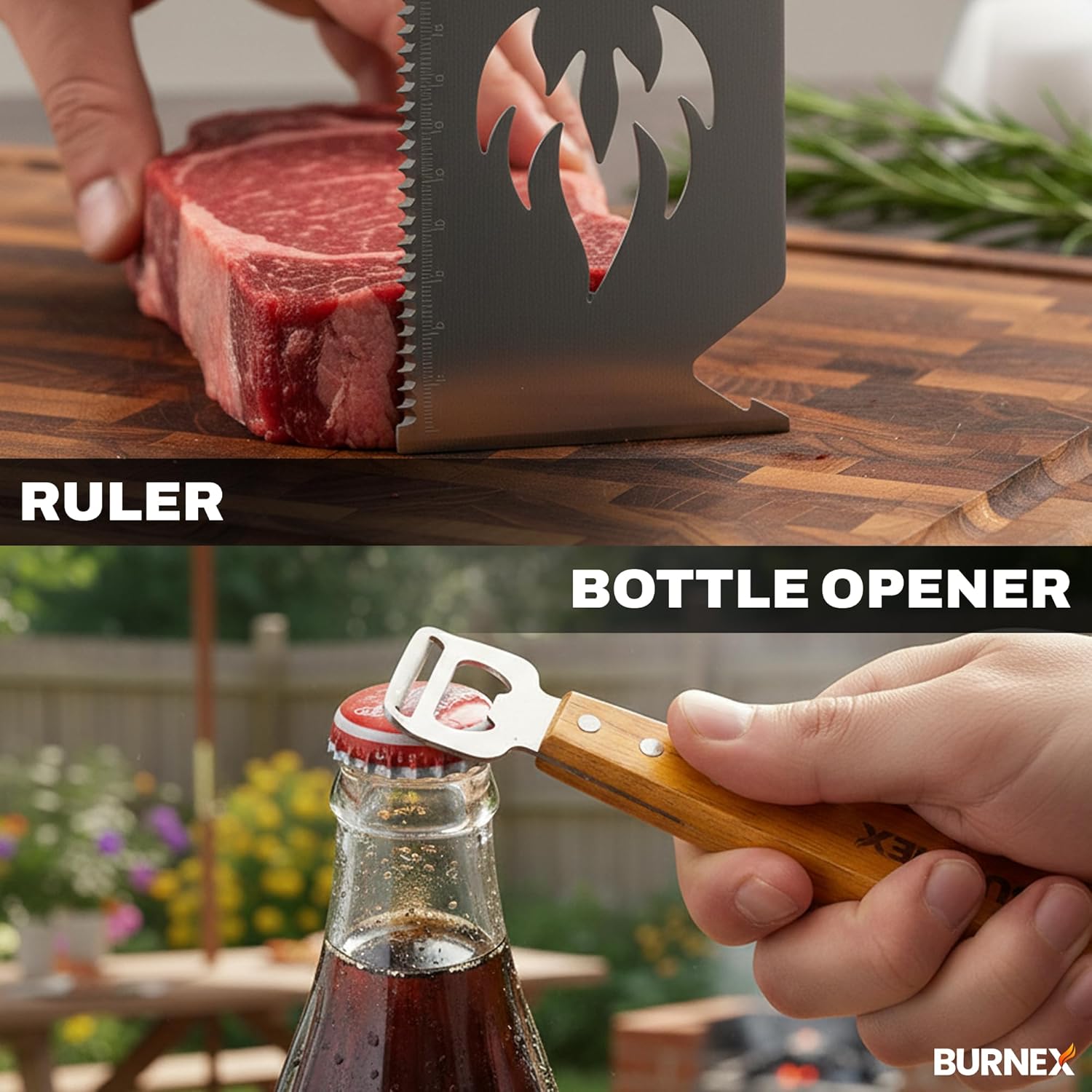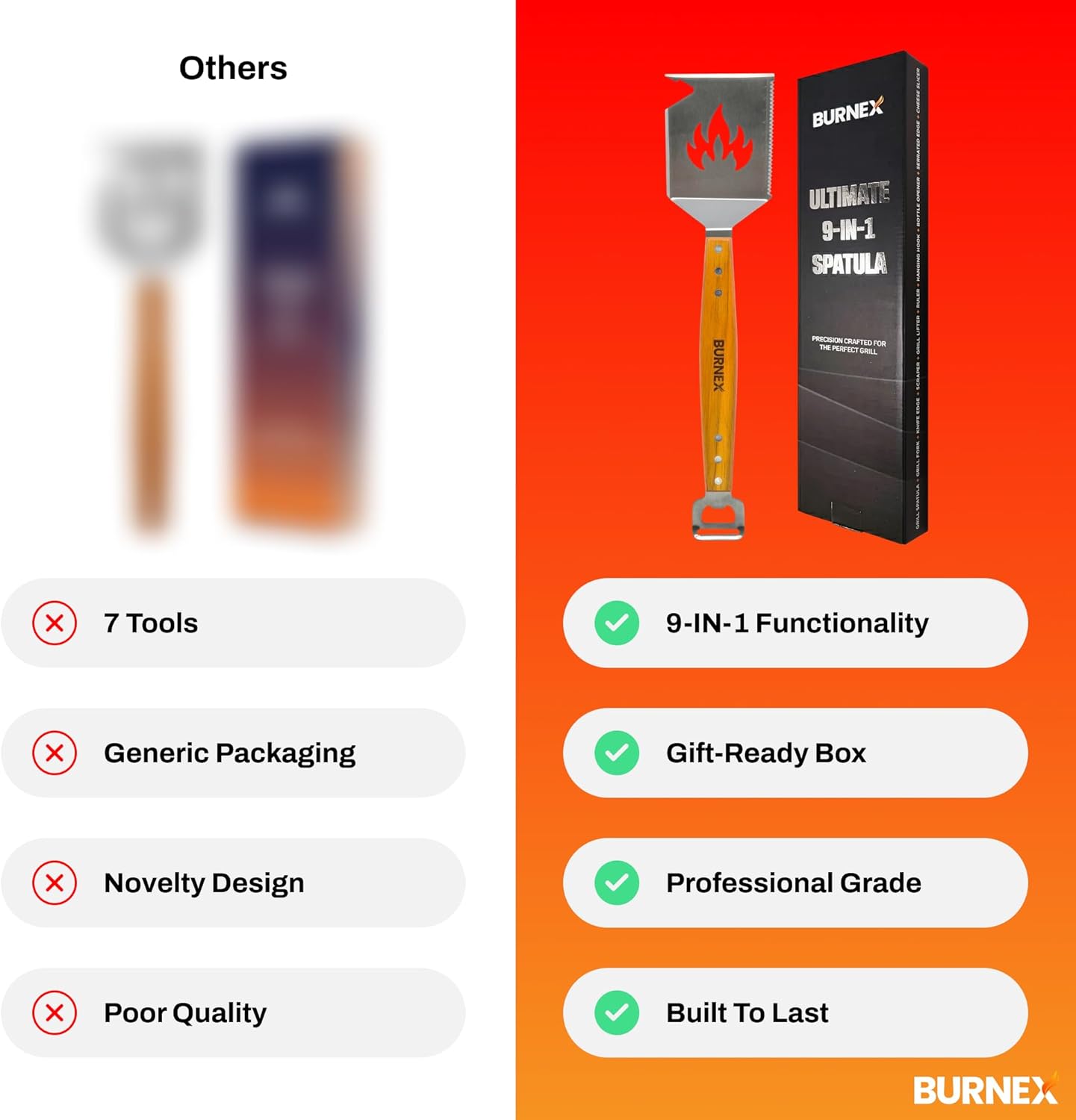 All-in-One BBQ MultiTool for BBQ Masters: Burnex bbq spatula is a versatile bbq tools with 9 tools including a scraper, grill lifter, bottle opener, ruler and cheese slicer all in one.