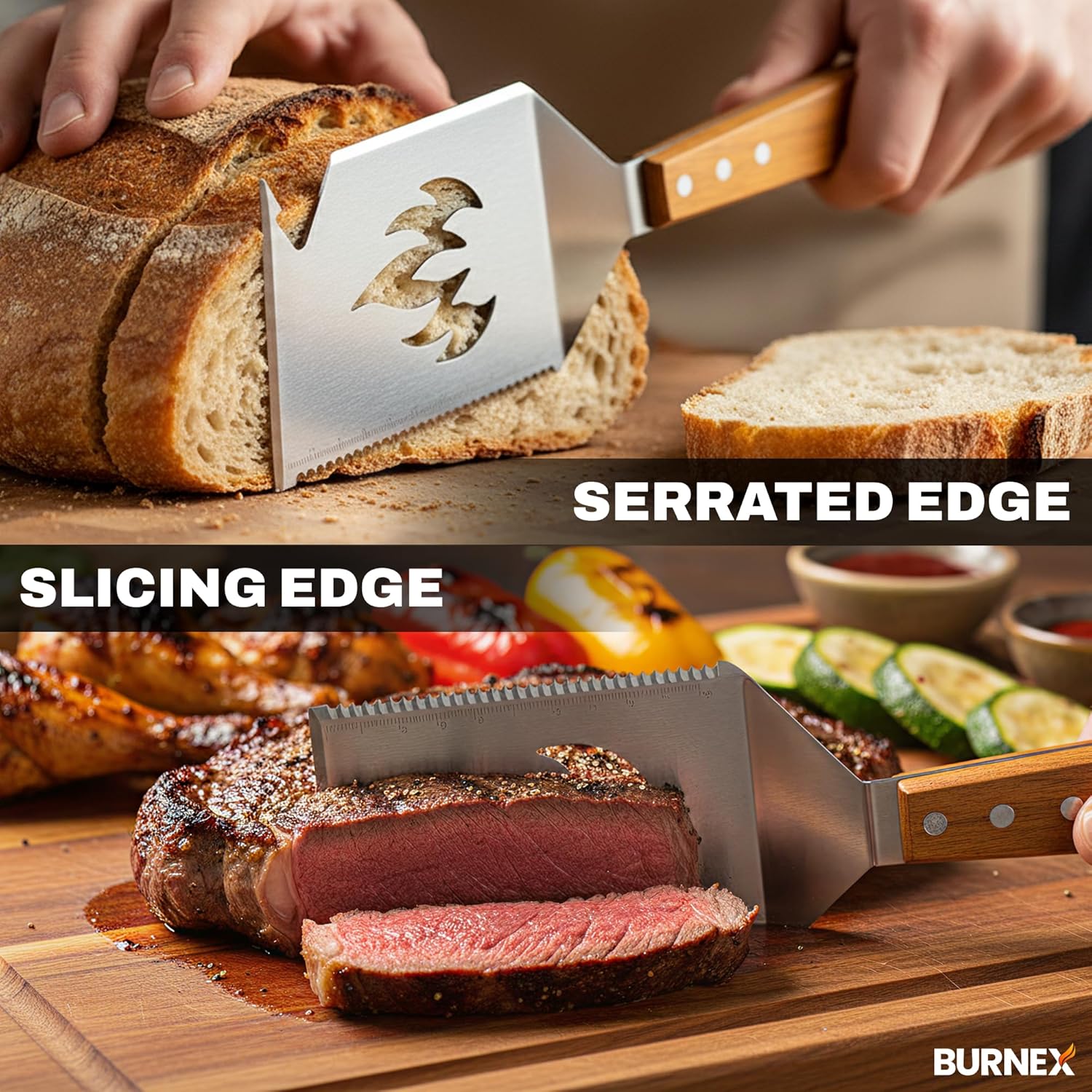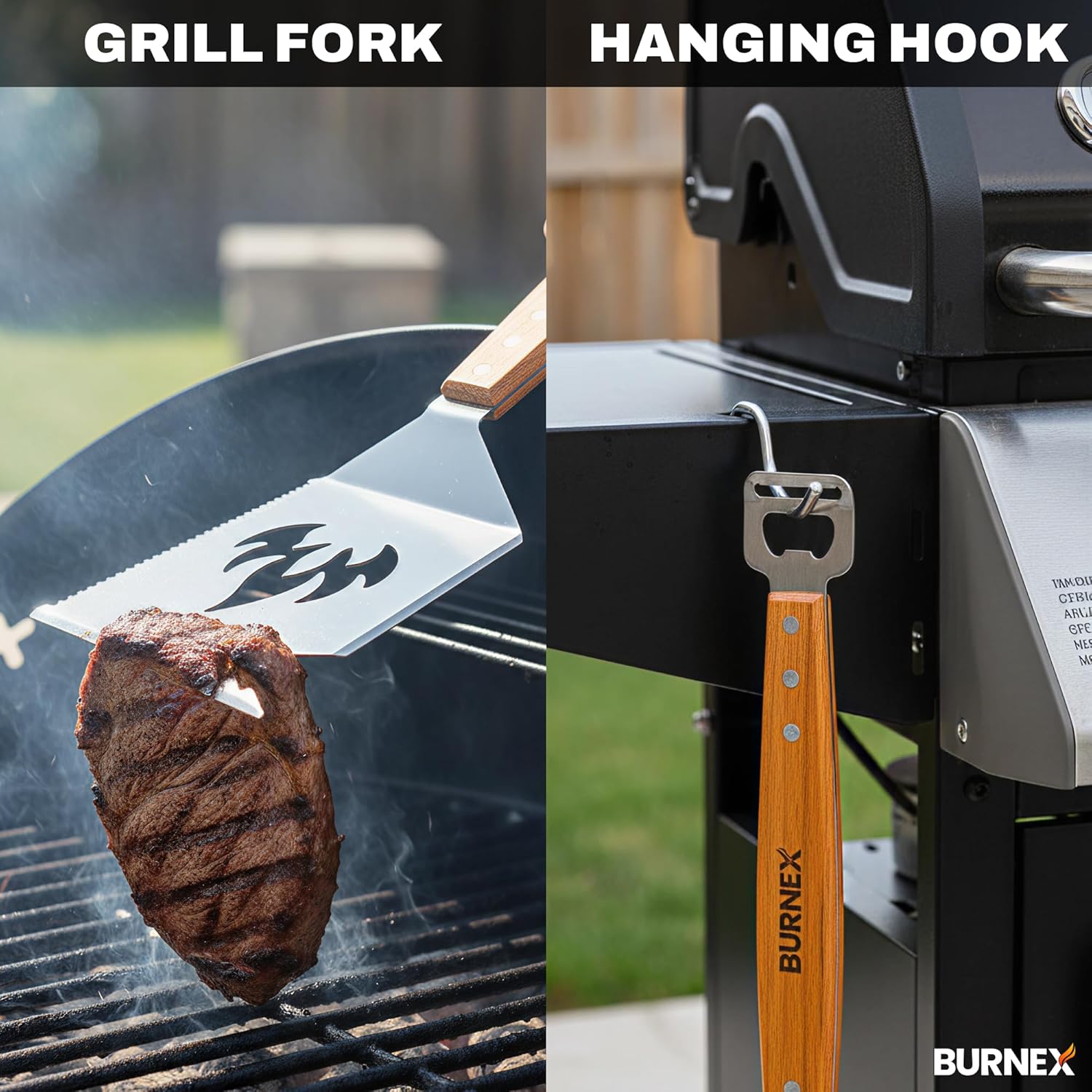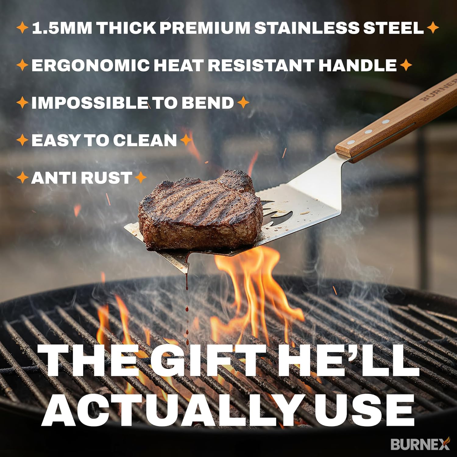 Heavy Duty, Built to Last: A durable bbq utensil set tool, acts as burger spatula built for grilling steaks, burgers & BBQ. Burnex provides versatile mens gifts, gifts for dad & christmas gifts for him.