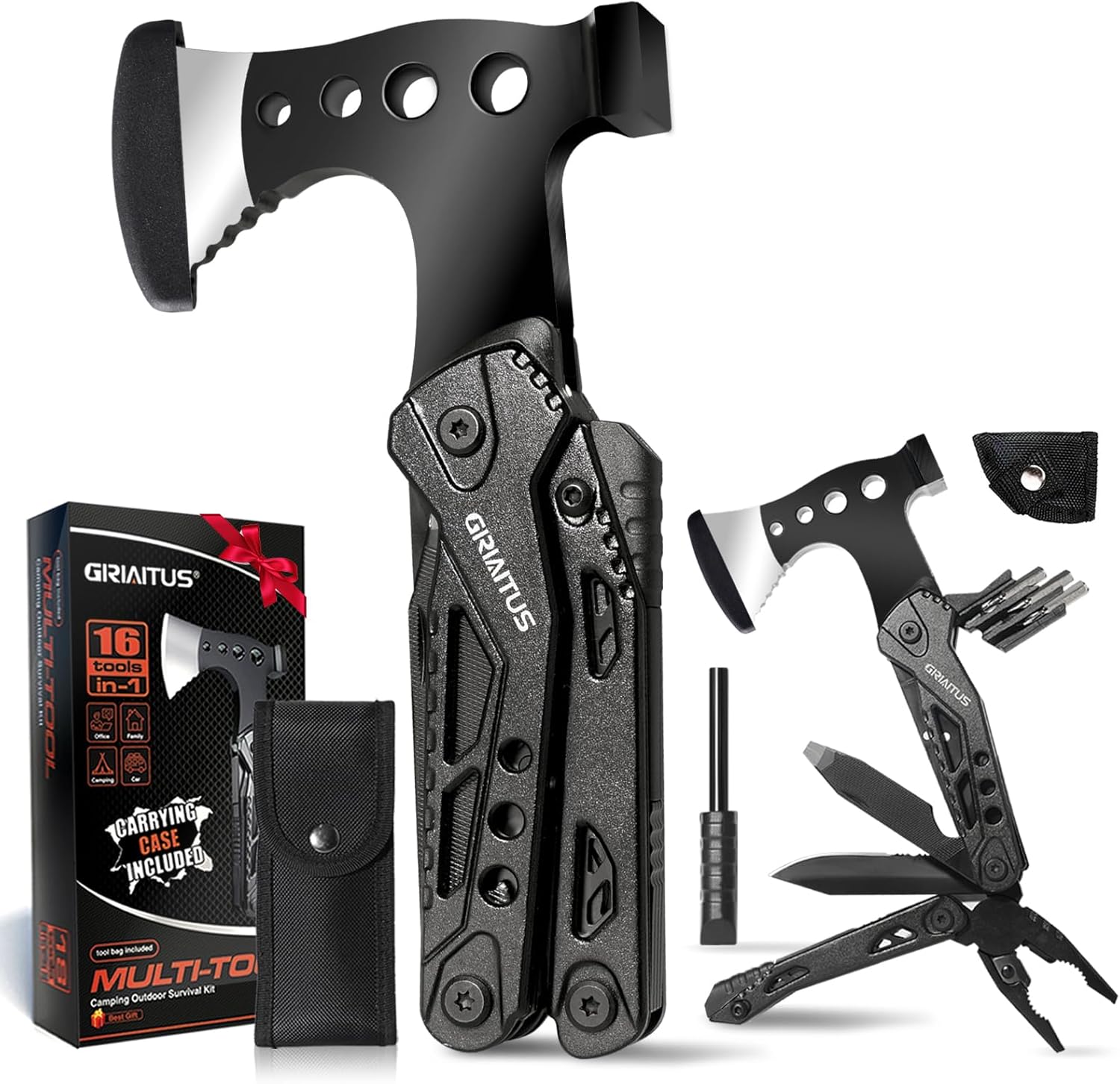 16in1 Multitool: Axe,Hammer, Nail Claw, Pipe Grip Pliers and Wire Cutter, Needle-nose Pliers, Saw, Serrated, File, Flathead Screwdrivers, Phillips Screwdrivers, Whistle, Flint Fire Starter, Bottle Opener and Silicone protective case, nylon protective case, storage bag.Our multitool Great choice as a for Camping Accessories, outdoor activities and housework Accessories.