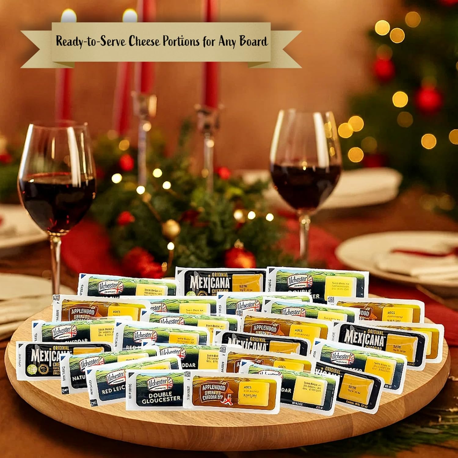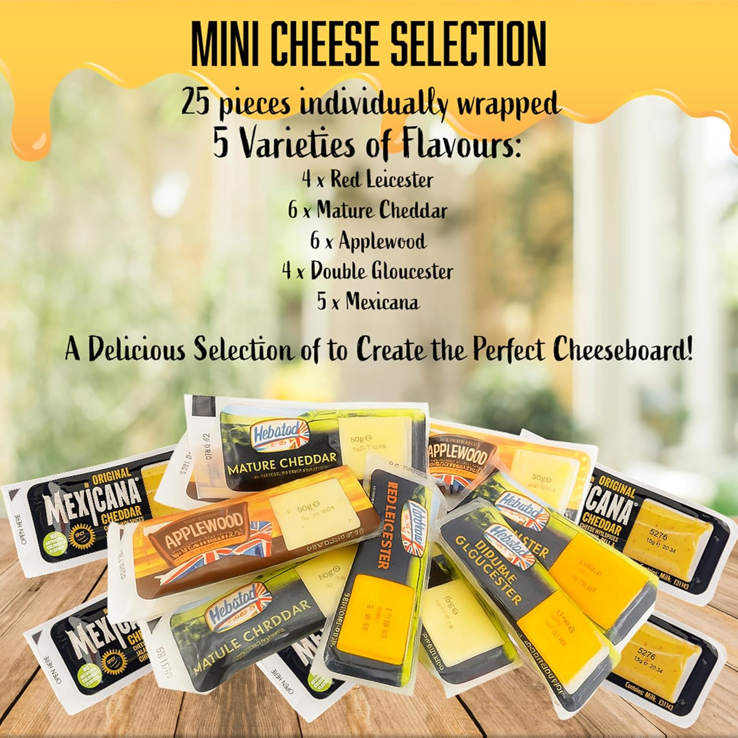 Elevate your cheese experience with our Cheese Selection for Cheese Board, a convenient pack featuring 25 individually wrapped portions. Perfect for any cheese enthusiasts, cheese hamper includes different flavourful cheese varieties: 4 x Red Leicester, 6 x Mature Cheddar, 6 x Smoky Cheddar Applewood, 4 x Double Gloucester & 5 x Mexicana cheese. This selection is an ideal choice for creating a delightful cheese gift set, or enhancing your hampers for special occasions.