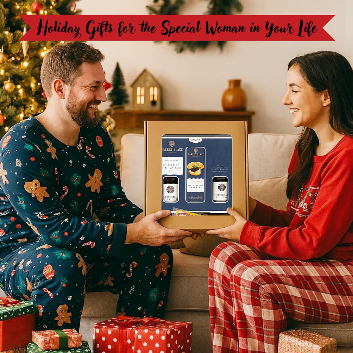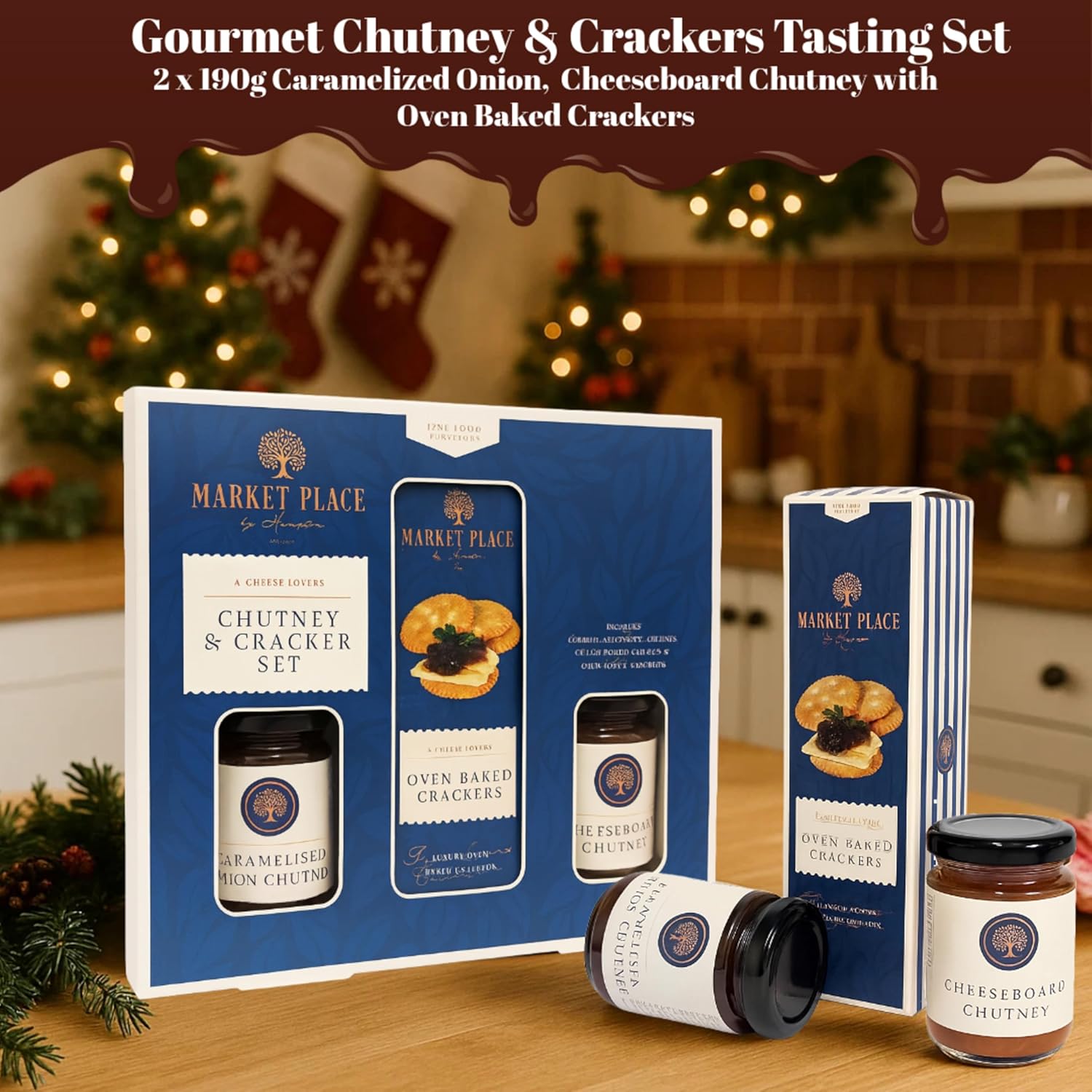 Market Place Selection of Chutney’s & Crackers Gift Set: Delicious Cheeseboard Chutney 190g and Caramelized Onion Chutney 190g preserves to get your testbeds tingling & 83g Cracker Round – presented in a stylish Gift Box for the cheese lover.