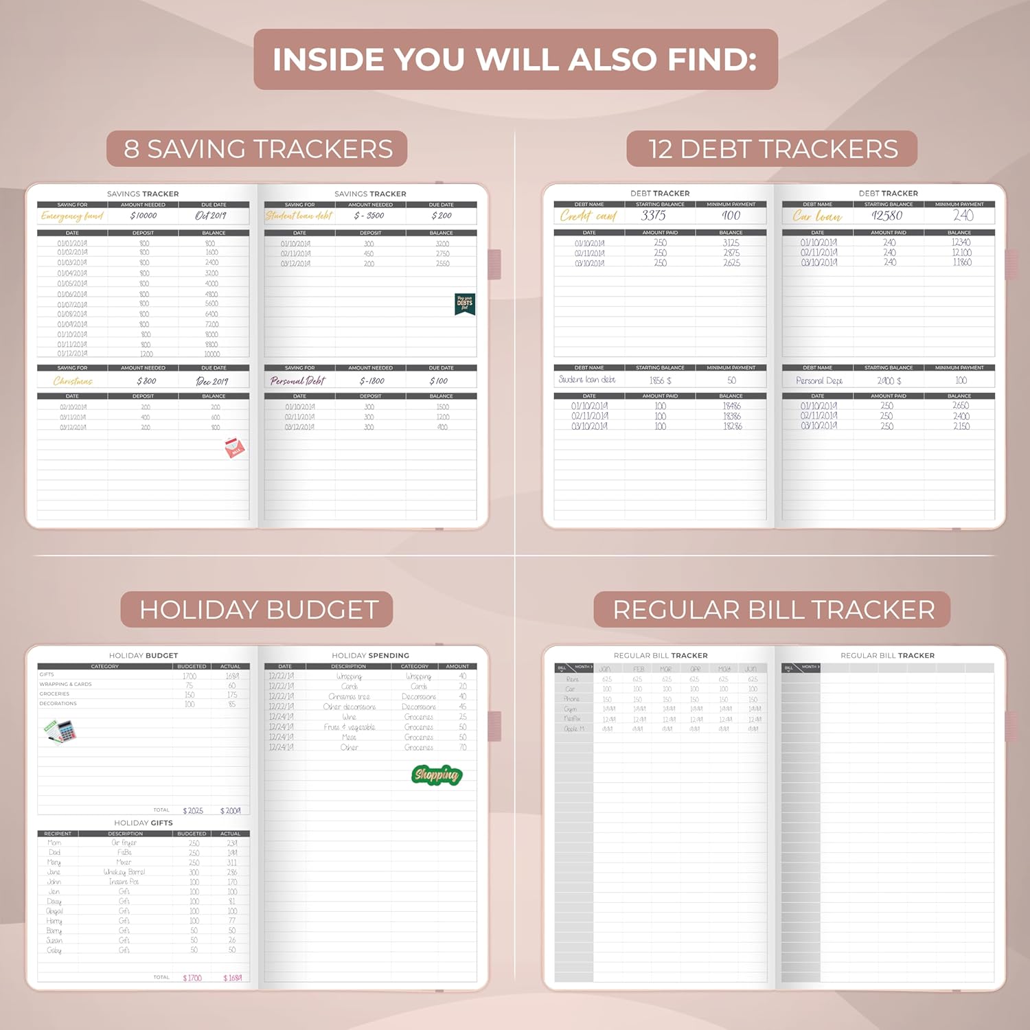 EASILY CONTROL YOUR SPENDING, DEBTS & SAVINGS – This money planner is undated and covers 12 months. Every month features a calendar, a budget plan, and an expense tracker. The budgeting planner also includes 8 savings and 12 debt trackers.