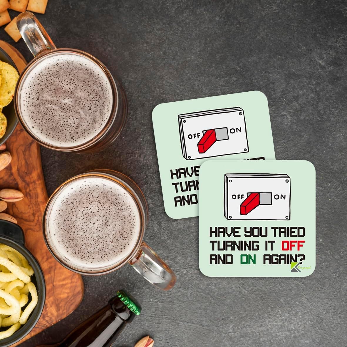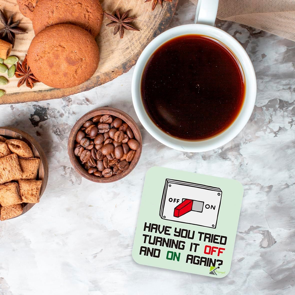 💻 THE SACRED FIRST QUESTION: For the unsung hero of every home and office. This coaster features the hallowed words of tech support: “Have You Tried Turning it Off and on Again?” It’s the ultimate badge of honour for the designated problem-solver.