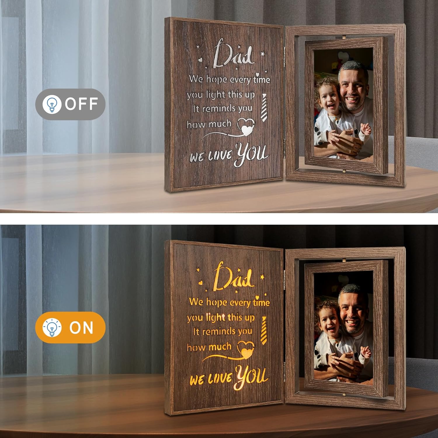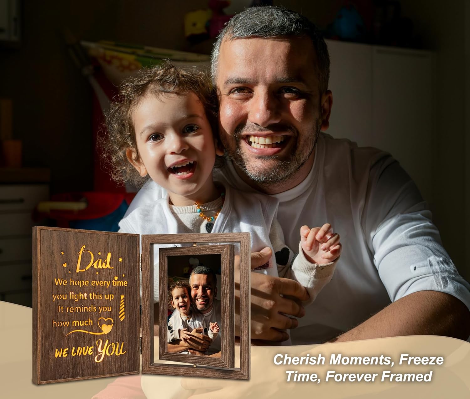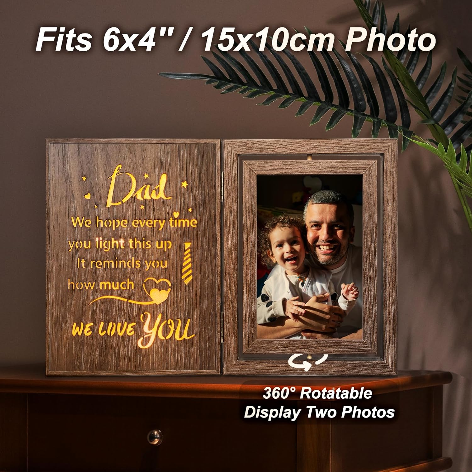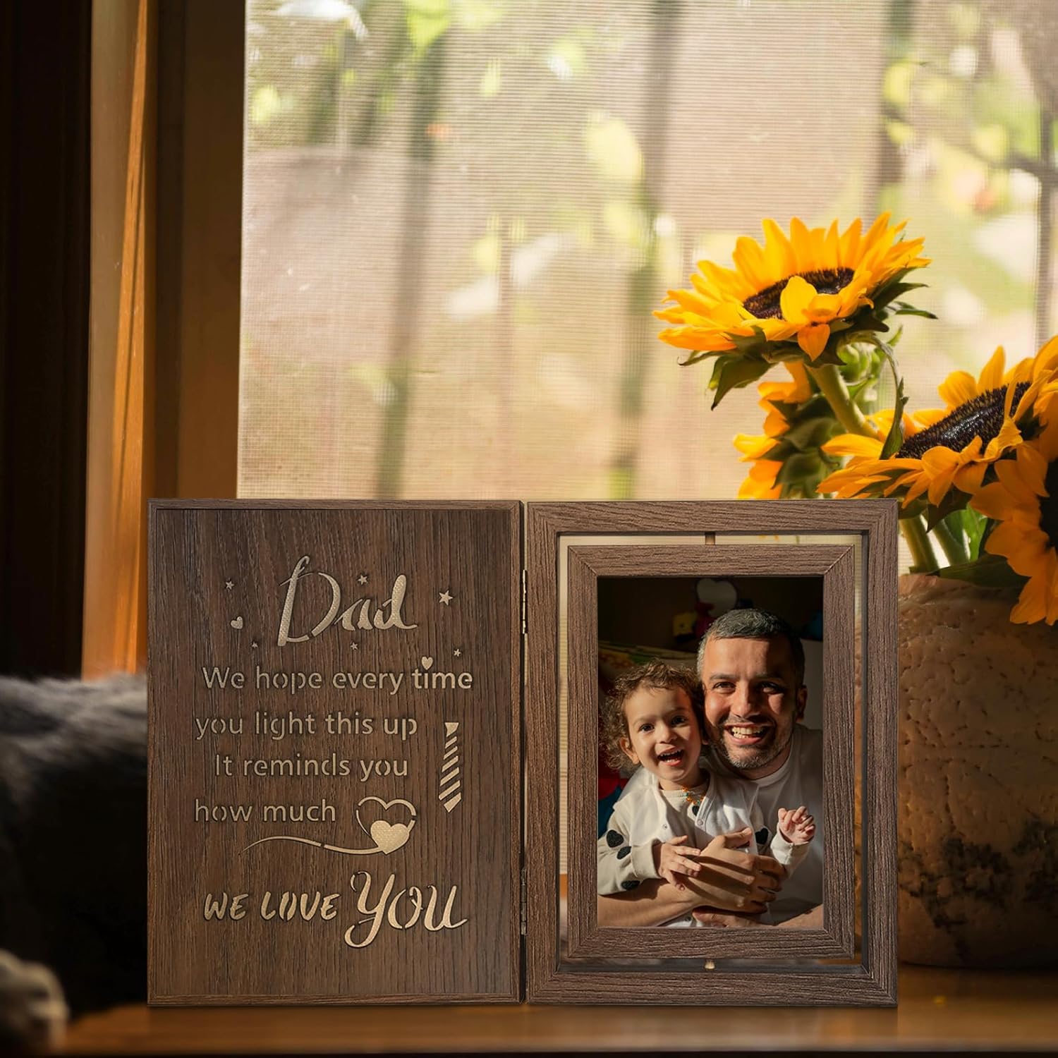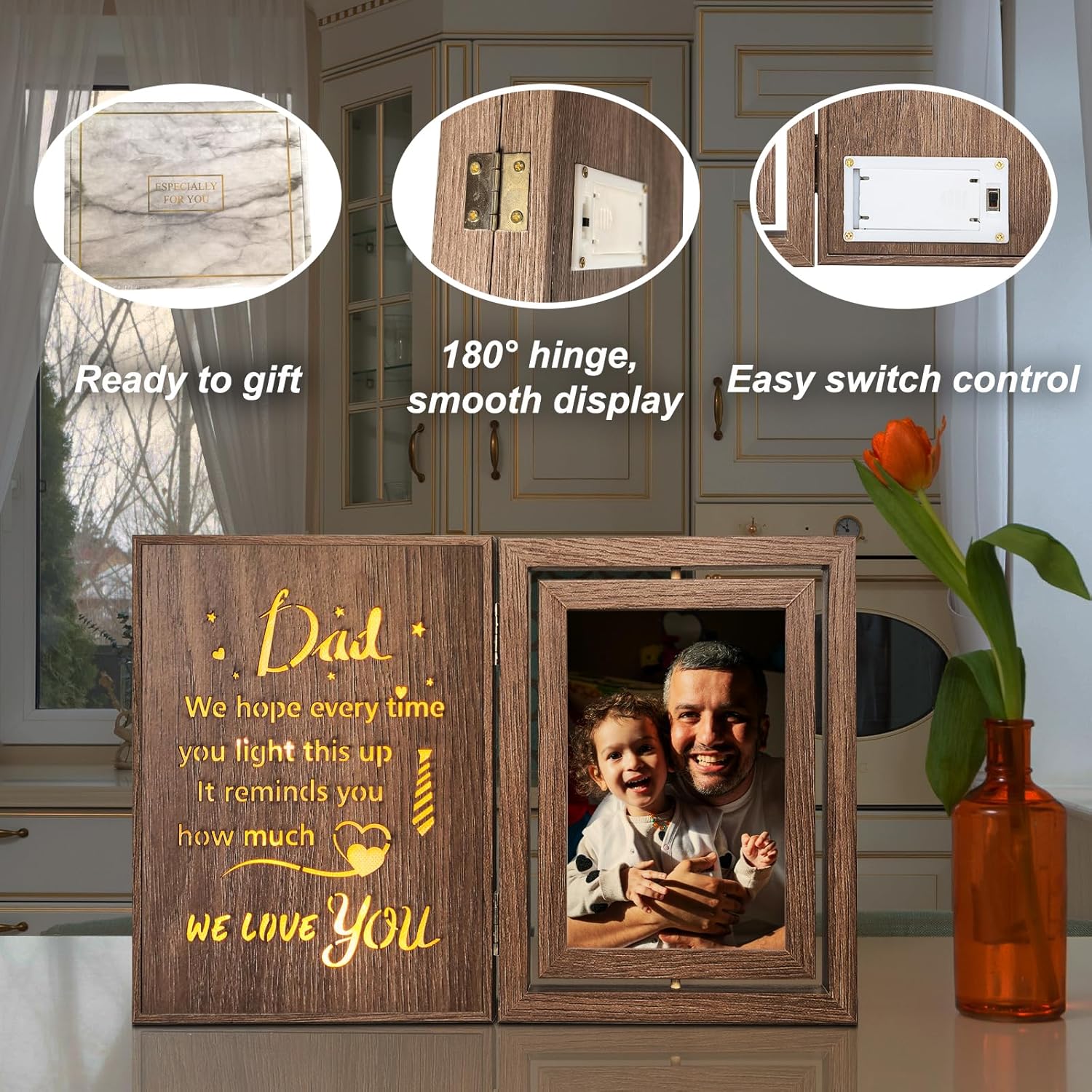 Illuminated Message for Dad – This dad photo frame features a warm light that highlights the touching quote: “Dad – We hope every time you light this up – It reminds you how much We love you.” Ideal for Father’s Day, birthdays, or Christmas