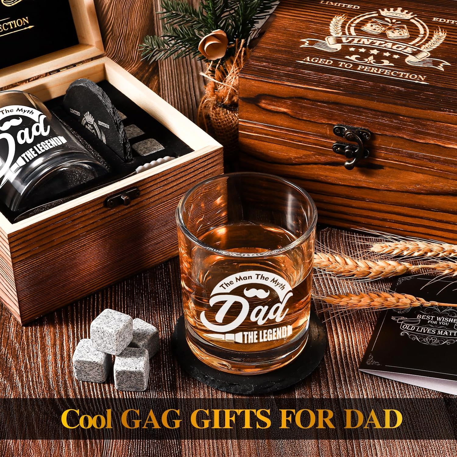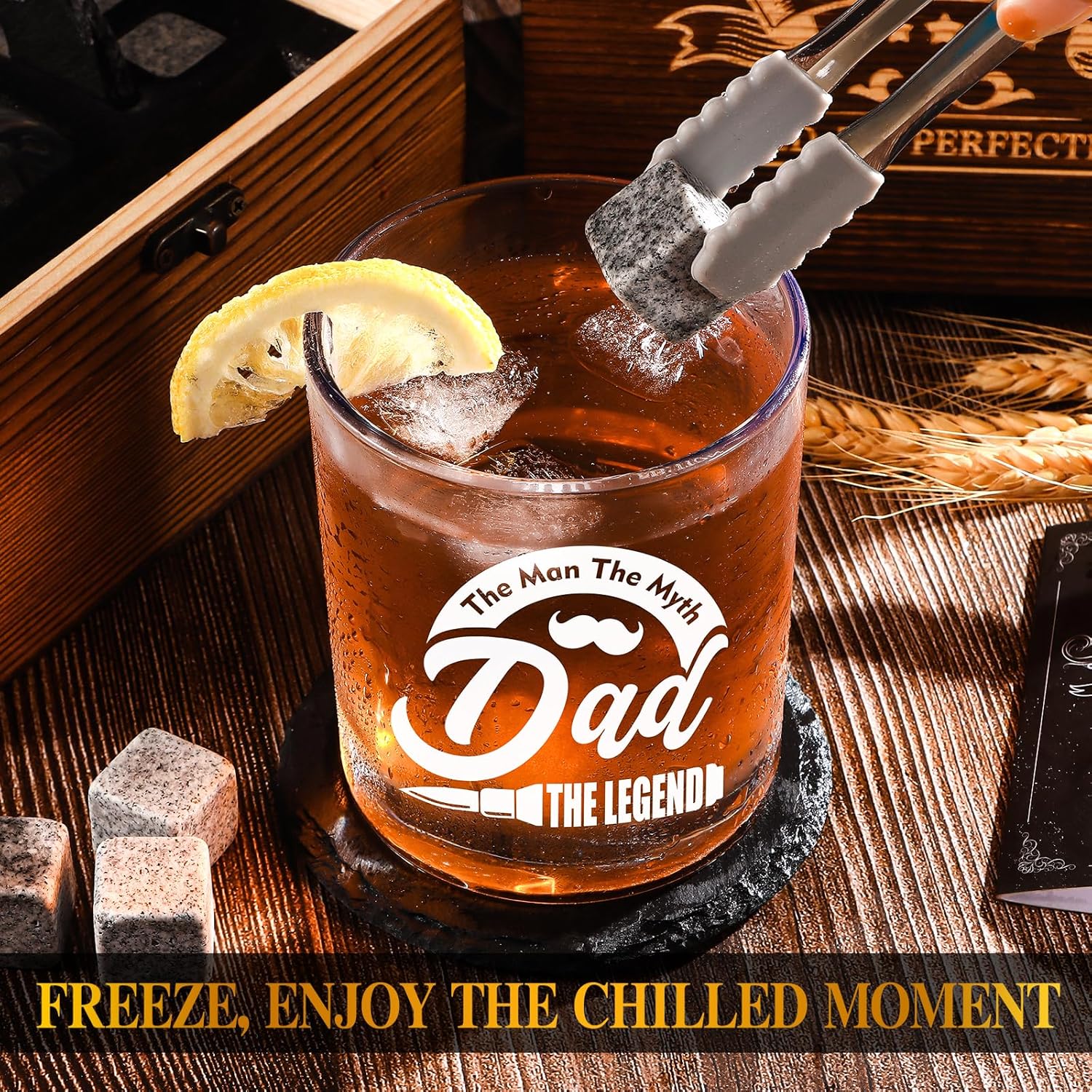 【 Cool Dad Gift Ideas 】All that whiskey lover needs in the wood box for dad: 12oz whiskey glass, slate coaster, 4pcs natural granite stones, ice tongs and gift card. More than just a whiskey glass set, it’s the perfect dad gifts on fathers day, dad birthday, thanksgiving day, christmas,etc. Crafted wooden box engraved with vintage pattern resonate with his journey into fatherhood, surprised them with the cool gag gifts for dad who has everything