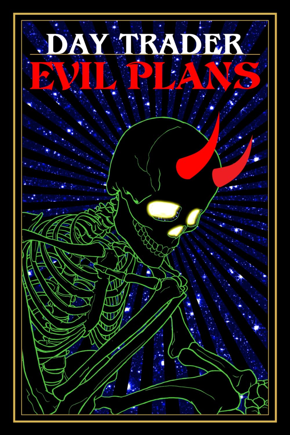 The theme is centered around day trading with a humorous and sinister twist, featuring an ominous skeleton with horns.