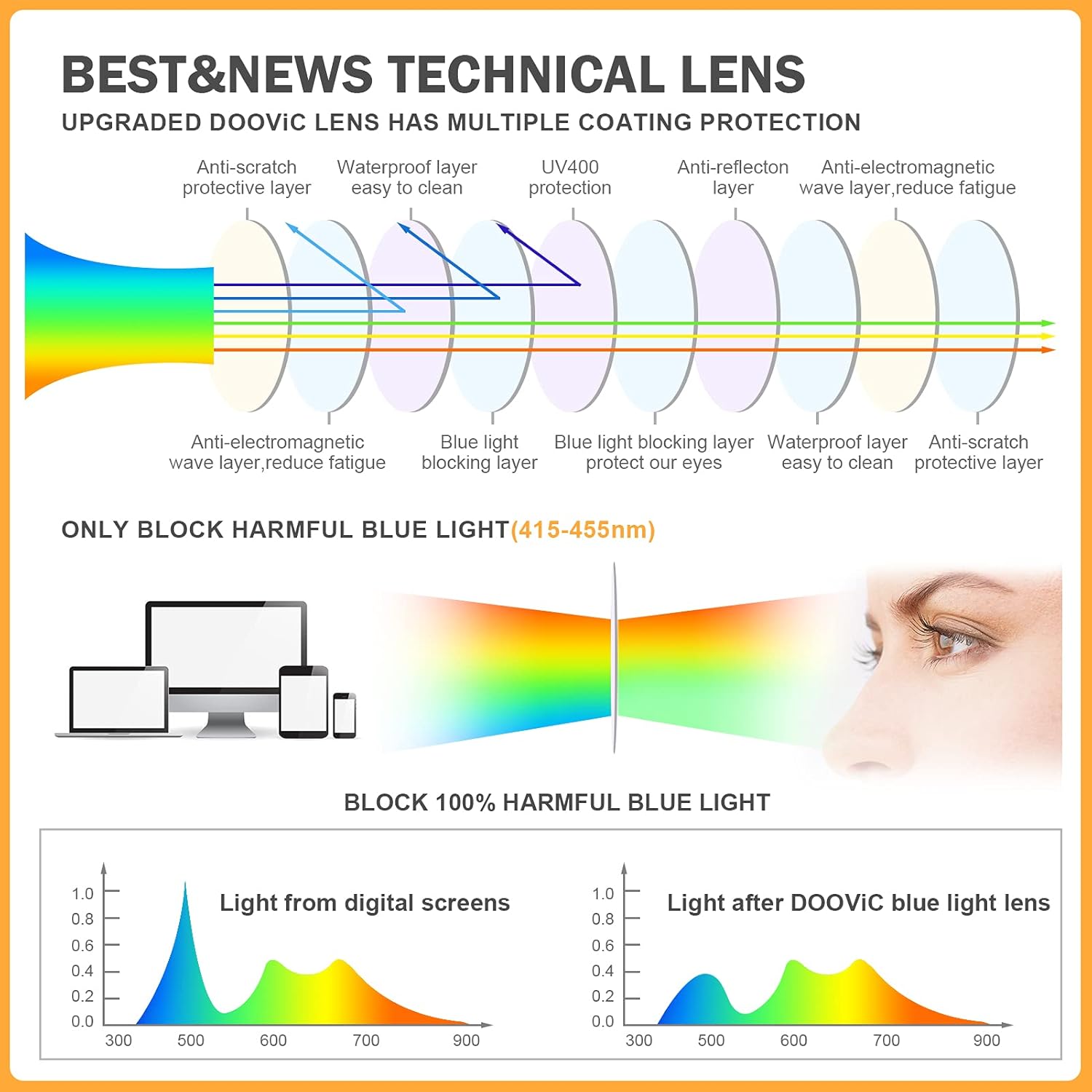 Infographic showing blue light spectrum effects on eyes, with device screens, wavelength measurements, and illustration of eye exposure paths.Infographic showing blue light spectrum effects on eyes, with device screens, wavelength measurements, and illustration of eye exposure paths.