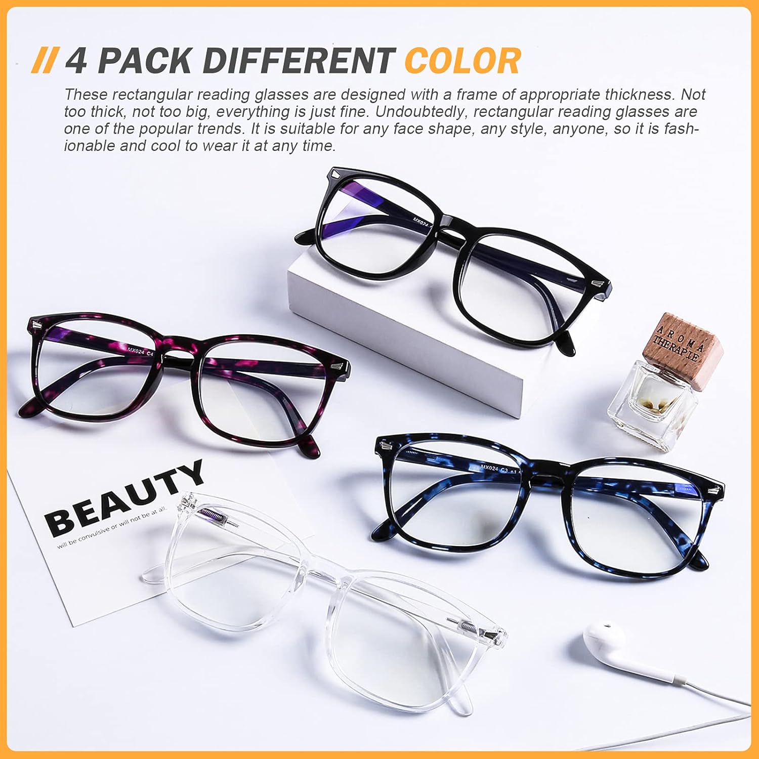 4 COLORS AVAILABLE Black Frame: Classic Clear Frame: Elegant Blue Tortoiseshell Frame: Fashion Purple Tortoiseshell Frame: Charm