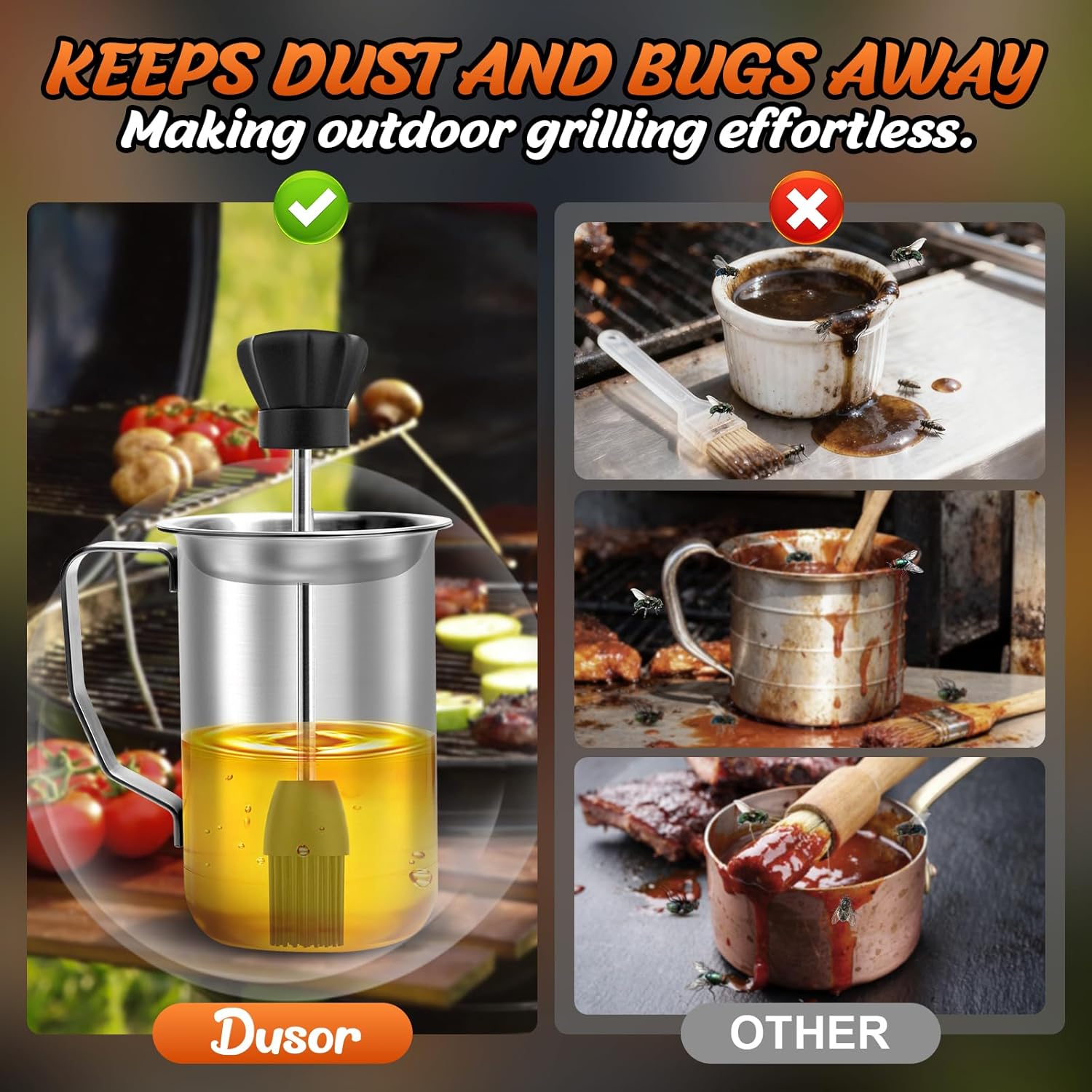 【Unique All in One Brush Lid Design】:Dusor bbq brush integrated brush and lid design keeps the brush securely in place and prevents spills, while also shielding sauces from wind, dust, and insects. Holds up to 510 ml of sauce, helping you portion perfectly and reduce waste.