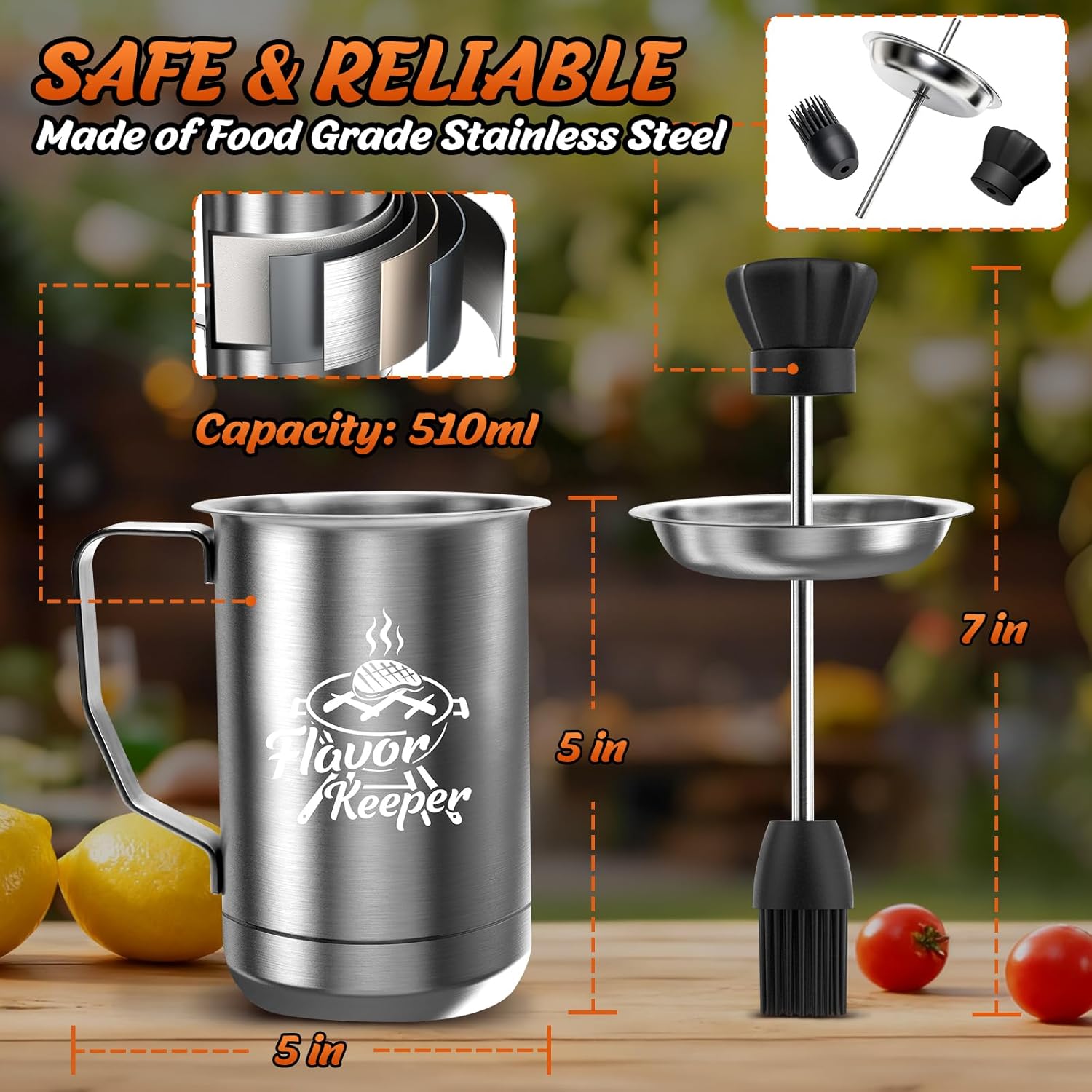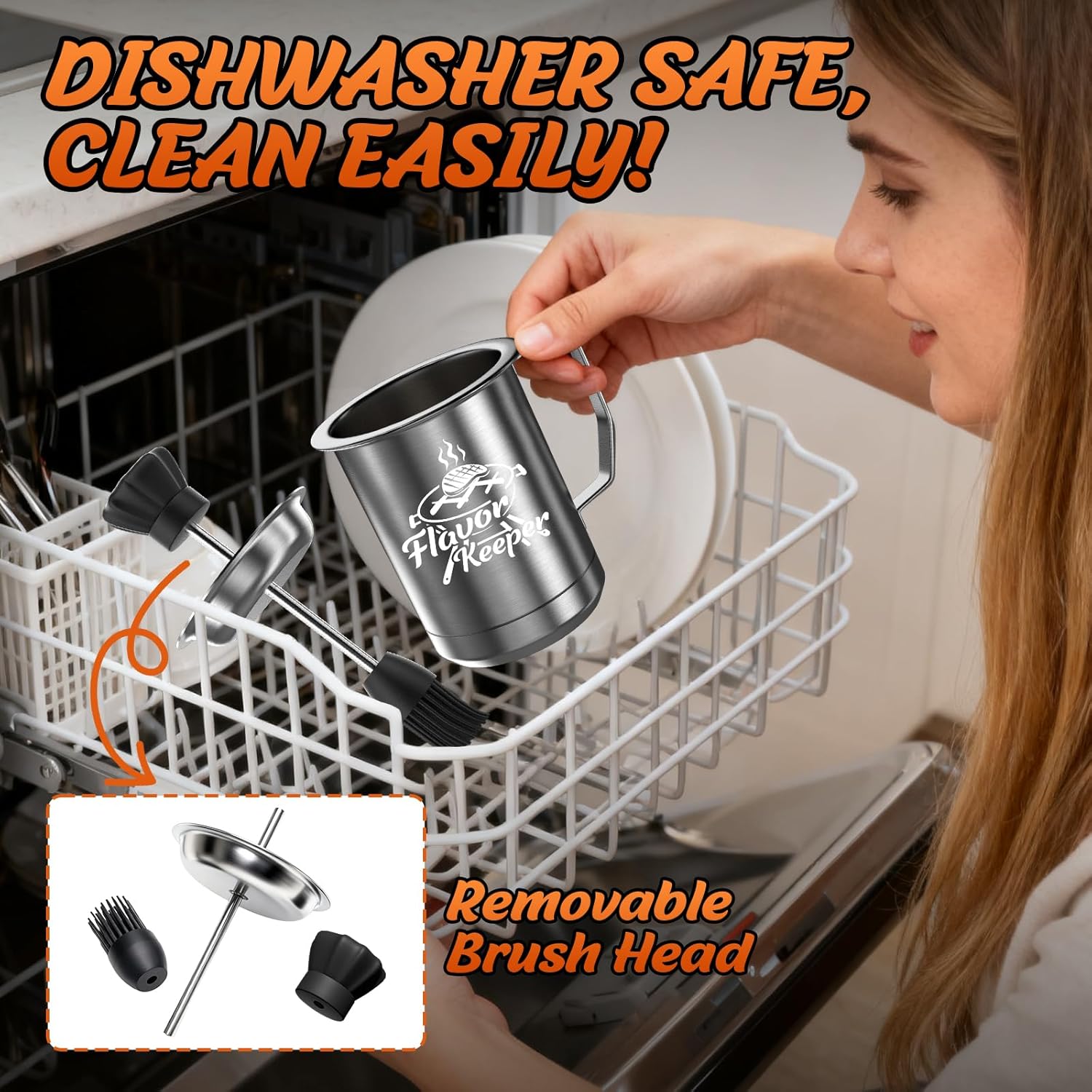 【Easy to Clean Built to Last】:BBQ Cup crafted from rust resistant, heat resistant stainless steel for durability, with a removable silicone brush head that is dishwasher safe for effortless cleaning. Comfortable non slip rubber handle ensures a firm grip while basting.