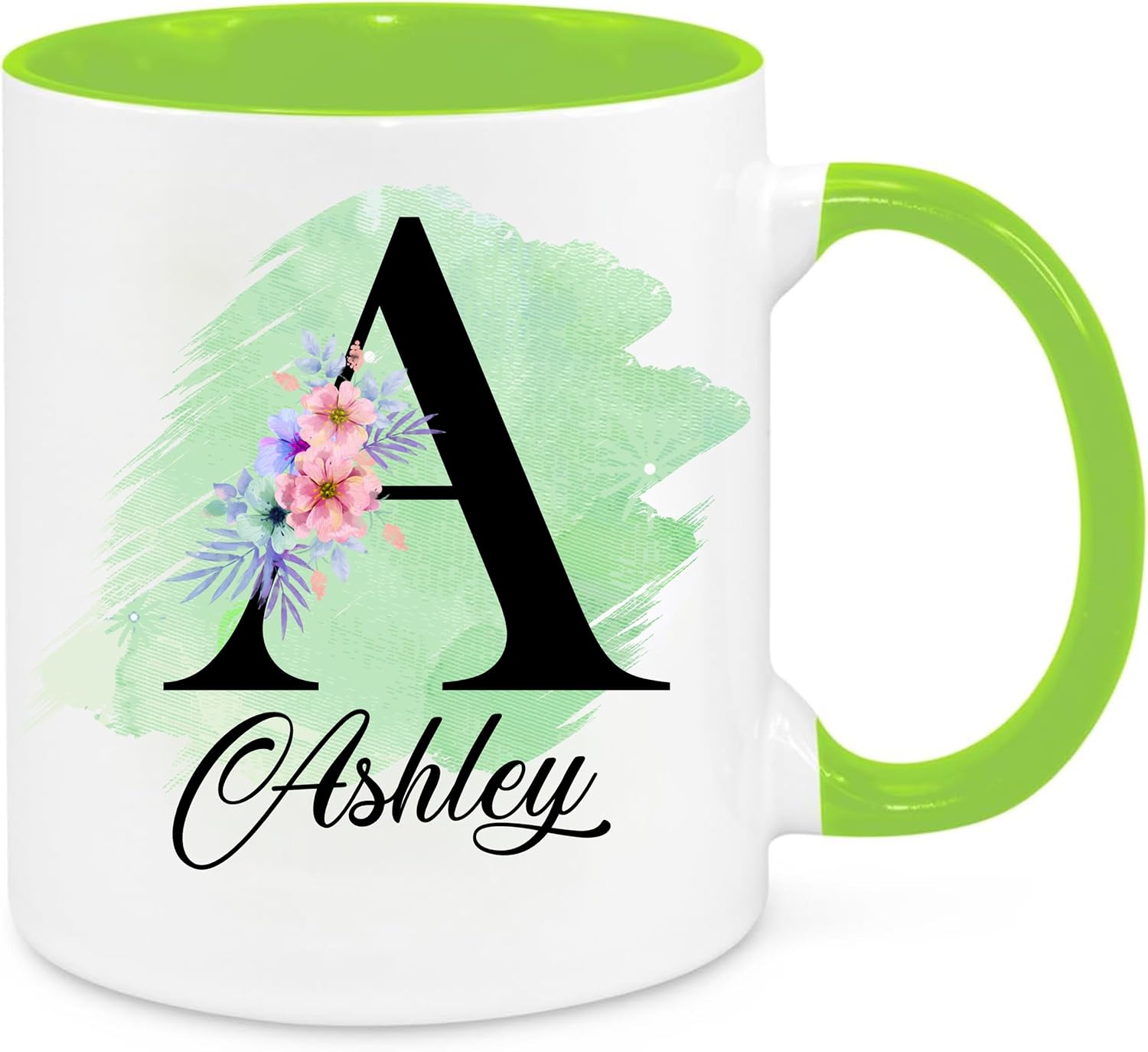 EKAM Personalised Mug, Coloured Inner and Handle Mug Stylish Initial with Name, Gift for Valentine’s, Birthday, Christmas Day for Mom, Dad, Kids, Friends or Girls, 11oz Coffee/Tea Cup (Light Green)
