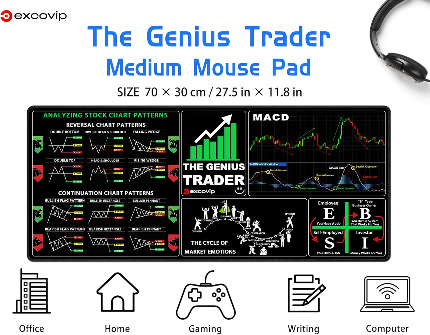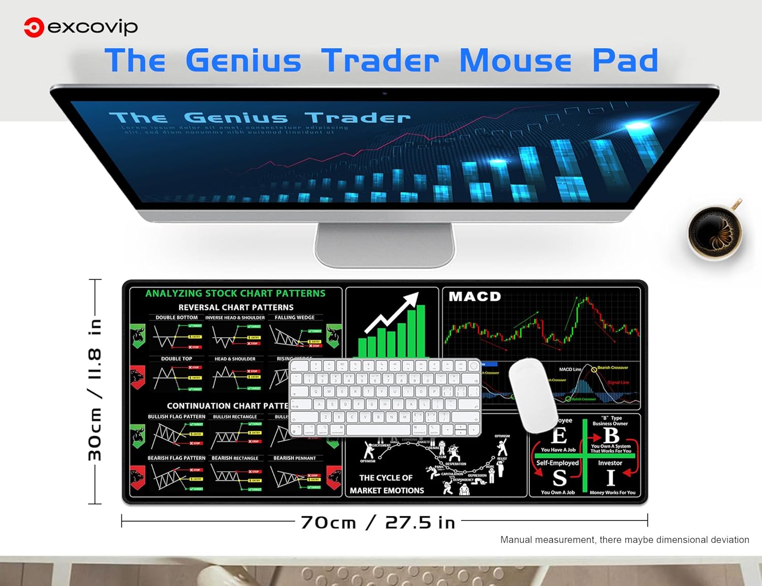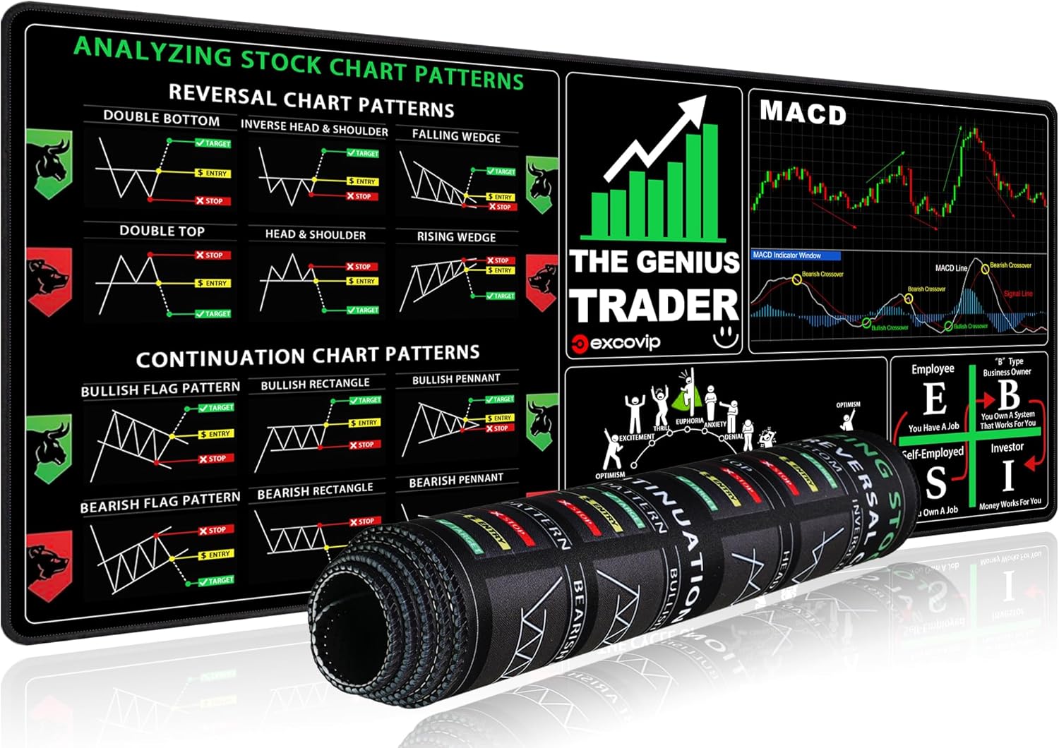 excovip Stock Market Invest Day Trader Trading Mouse Pad Chart Patterns Cheat Sheet,Large Computer Mouse Pad/Desk Mat with Stitched Edges 700x300mm 0379