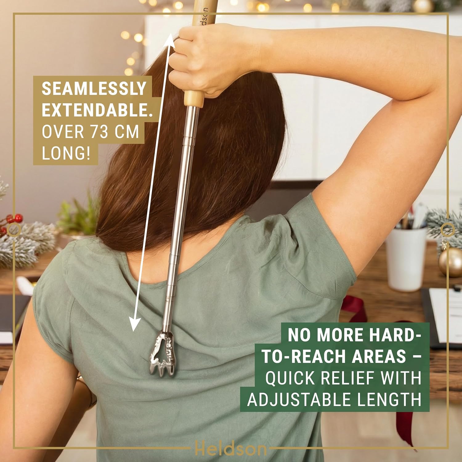 EXTRA LONG RANGE – The telescopic back scratcher made of stainless steel stretches up to 73 cm, helping you easily reach tricky spots on your back. The best massage tool for your back scratch!