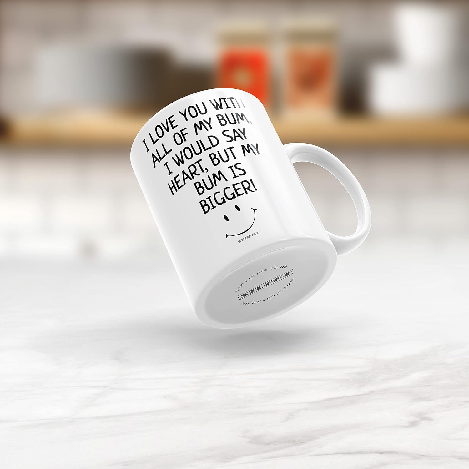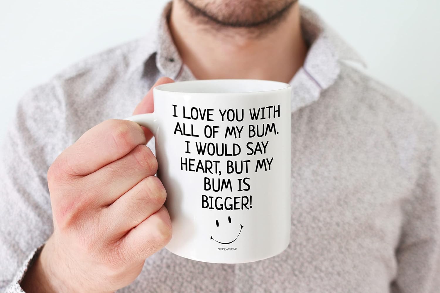 MAKE THEM SMILE ON VALENTINE’S DAY: If you are looking for valentines day i love you gifts for him boyfriend birthday gifts then look no further. This exceptional quality mug bears the wording – I Love You with All of My Bum. I Would Say Heart But My Bum is Bigger – It’s bound to make them smile. Not just for valentine’s day this mug could be as a birthday gifts for him also. Celebrate your relationship with this mug for anniversary, boyfriend’s christmas gifts from girlfriend.