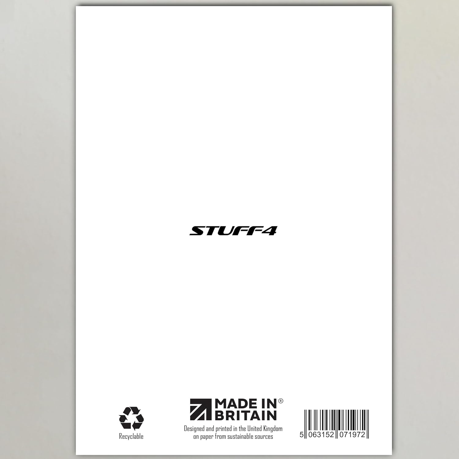 WHAT DO YOU GET: The card is printed on one side and BLANK ON THE INSIDE to allow you to write your very own message. The unique fun design is printed on a specially sourced and environmentally responsible board. At 360 microns thick the natural white one-sided gloss board has a quality look and feel. Supplied with a coloured gummed envelope to complement the design and ready to be sealed and sent in the post.