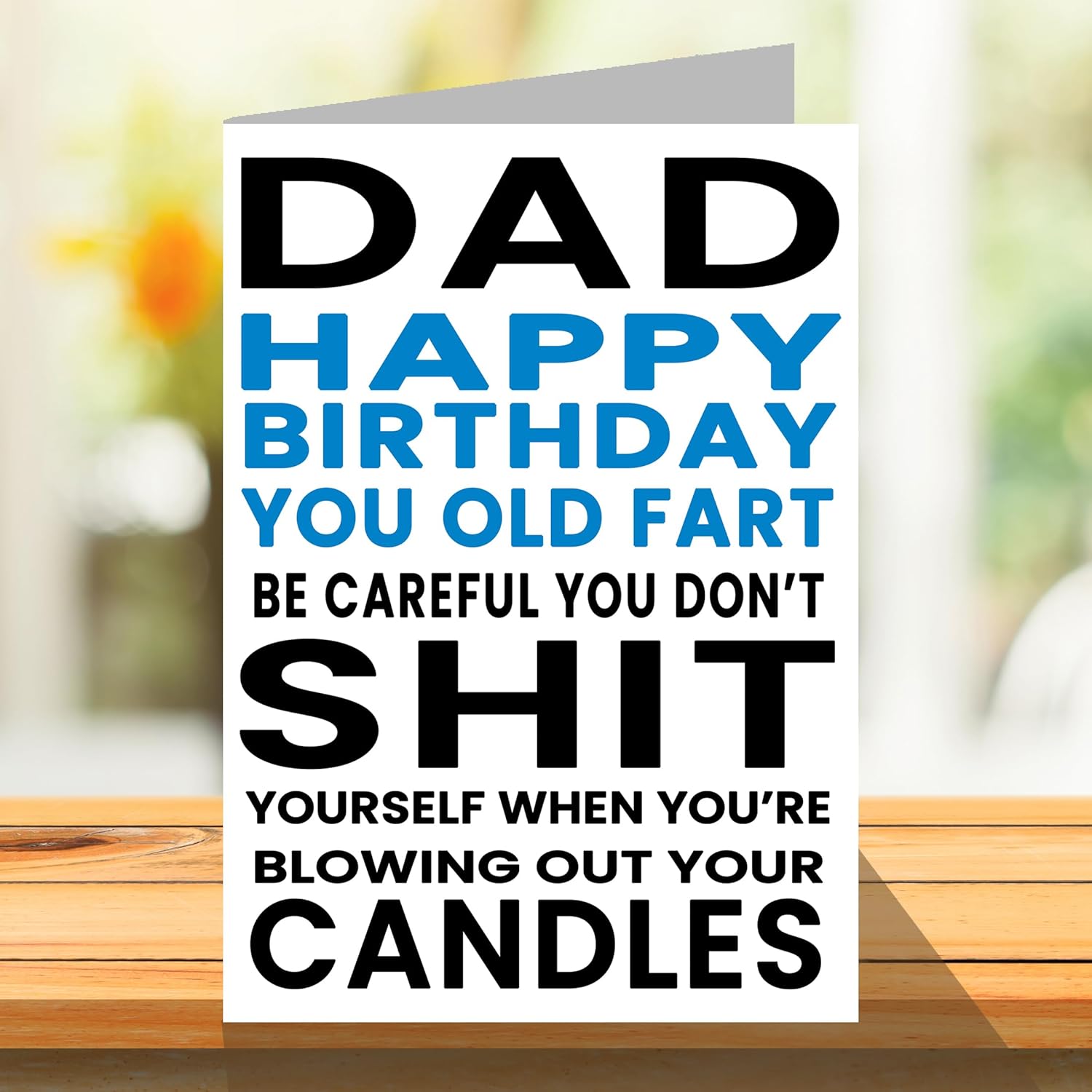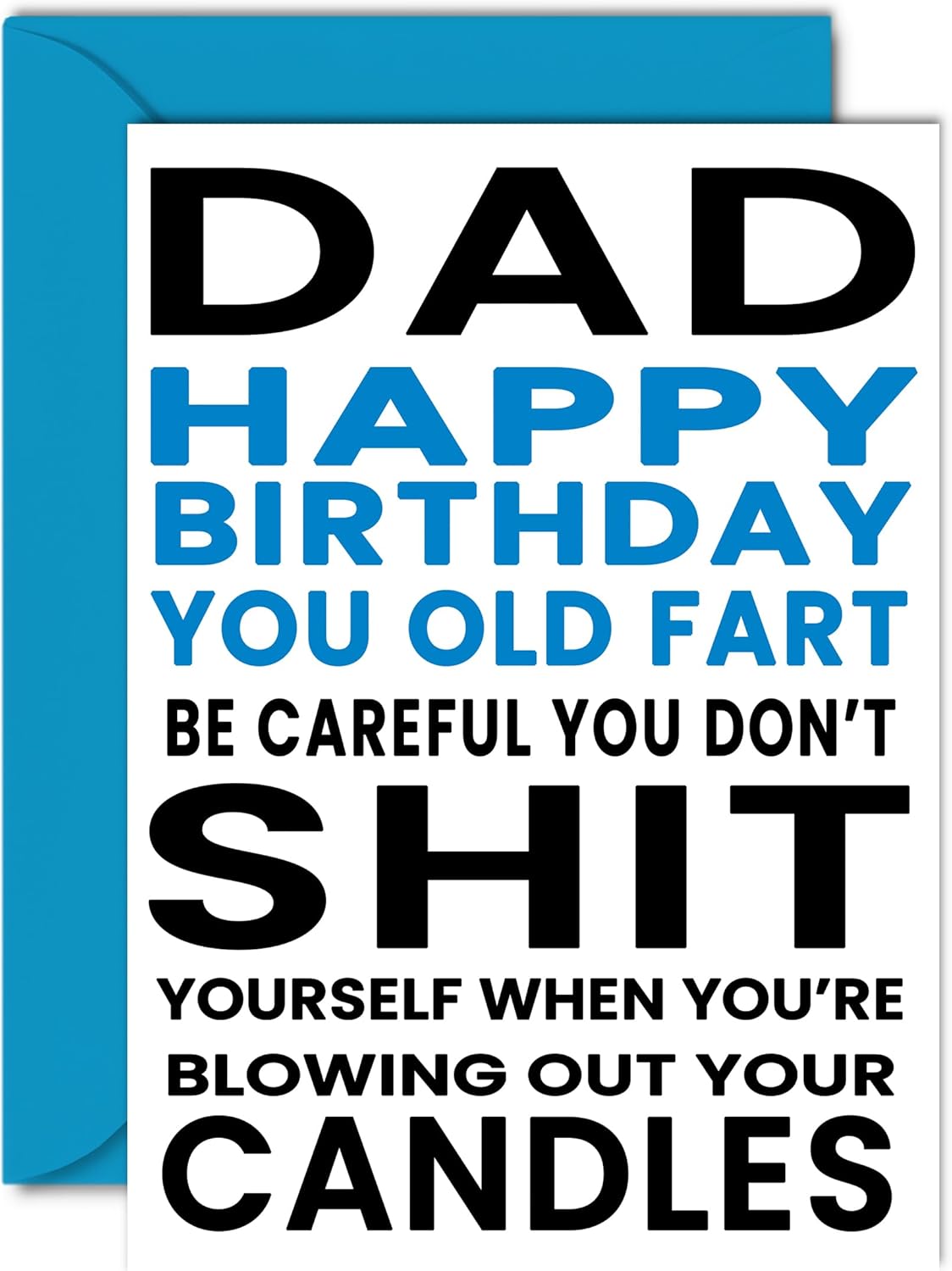 MAKE DAD LAUGH WITH THIS HILARIOUS HAPPY BIRTHDAY CARD DAD: This exceptional quality birthday card for him shows the design “Happy Birthday You Old Fart Be Careful You Don’t Shit Yourself When You’re Blowing Out Your Candles”. If you are looking for funny birthday greetings cards for him, then this happy birthday card is bound to make them laugh. Not just for birthday gifts for Dad this could also be a birthday card for Dad, Daddy, Papa or Father.
