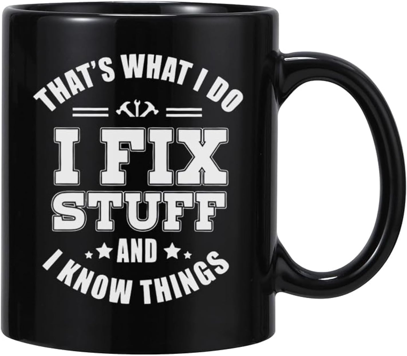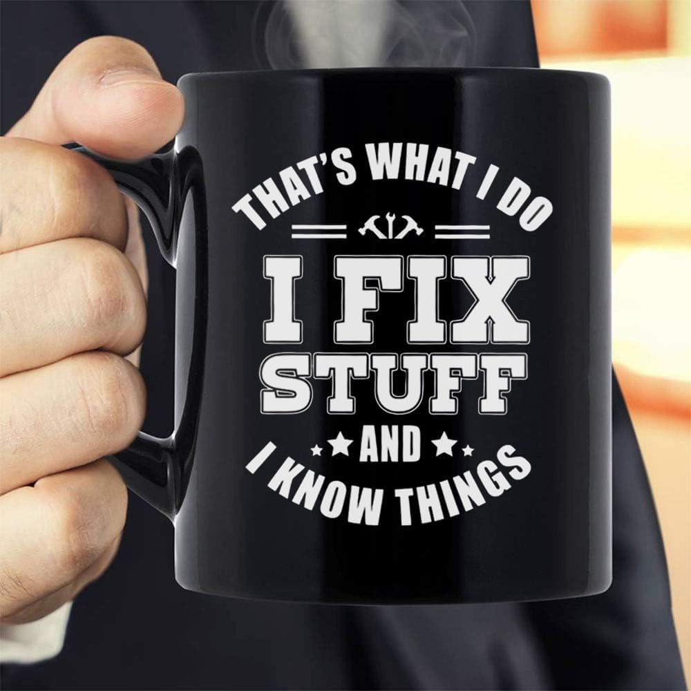 Design: That’s What I Do I Fix Stuff And I Know Things Black design makes this mug Unique Design is on both sides of the cup All designs are lead free. High quality ceramic Microwave safe Great for hot or cold drinks Comfortable, C-handle 11 ounce capacity Individually packaged in a box