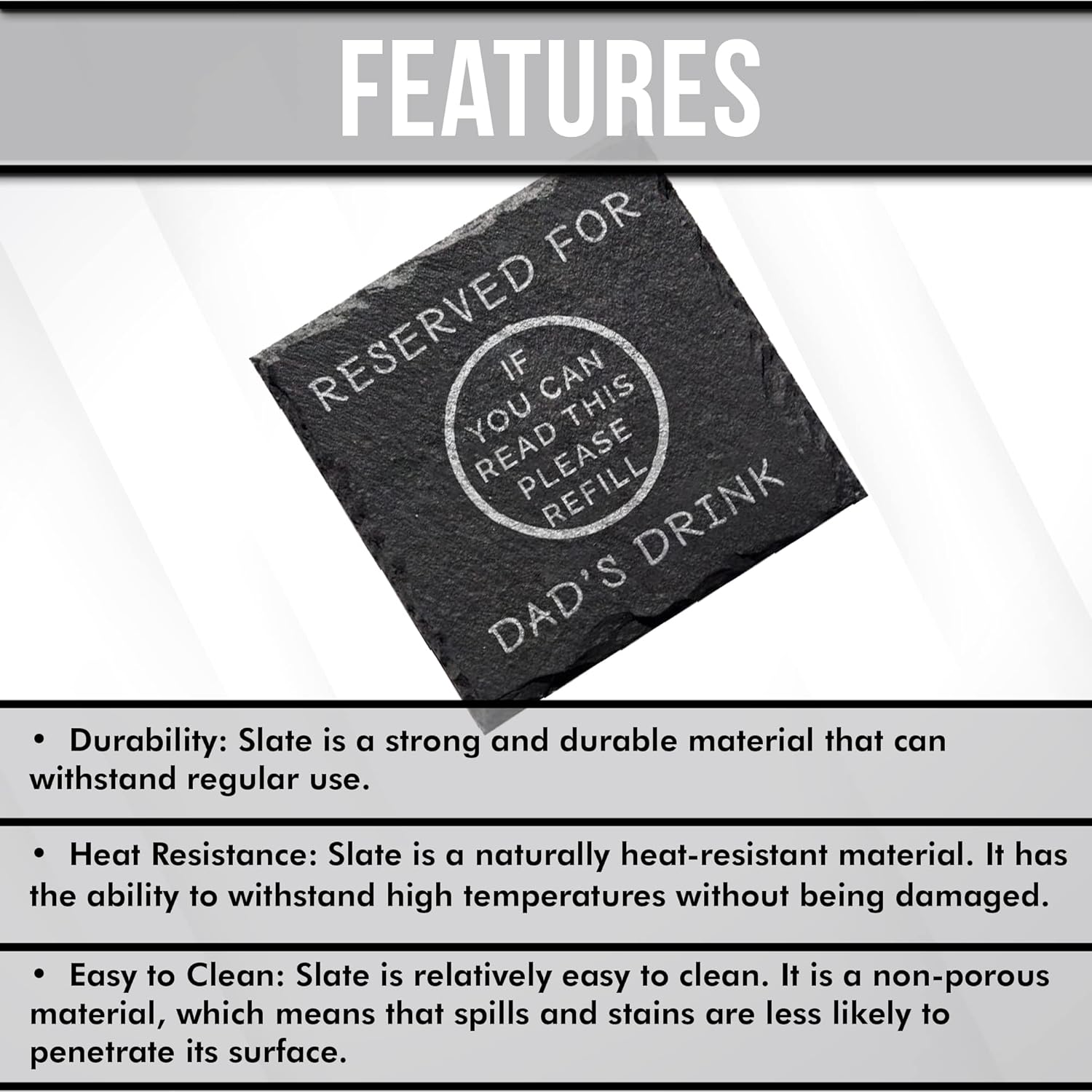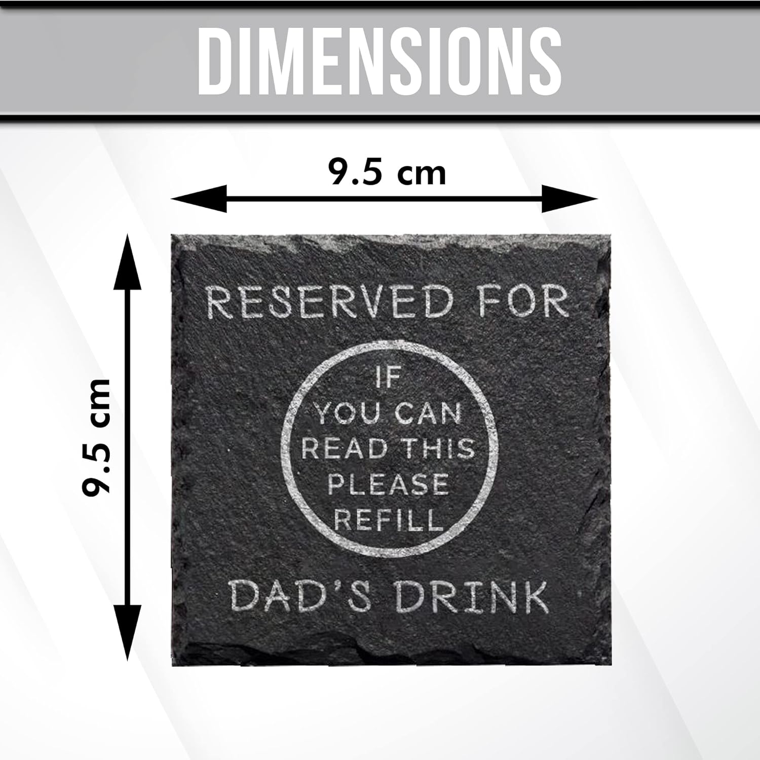 Introducing the stylish and humorous drinks coaster, designed to bring a touch of charm and laughter to your dad’s daily beverage routine! Crafted with care, this coaster measures 10cm x 10cm and is made from natural slate, adding a rustic and unique touch to your dad’s drink setup.