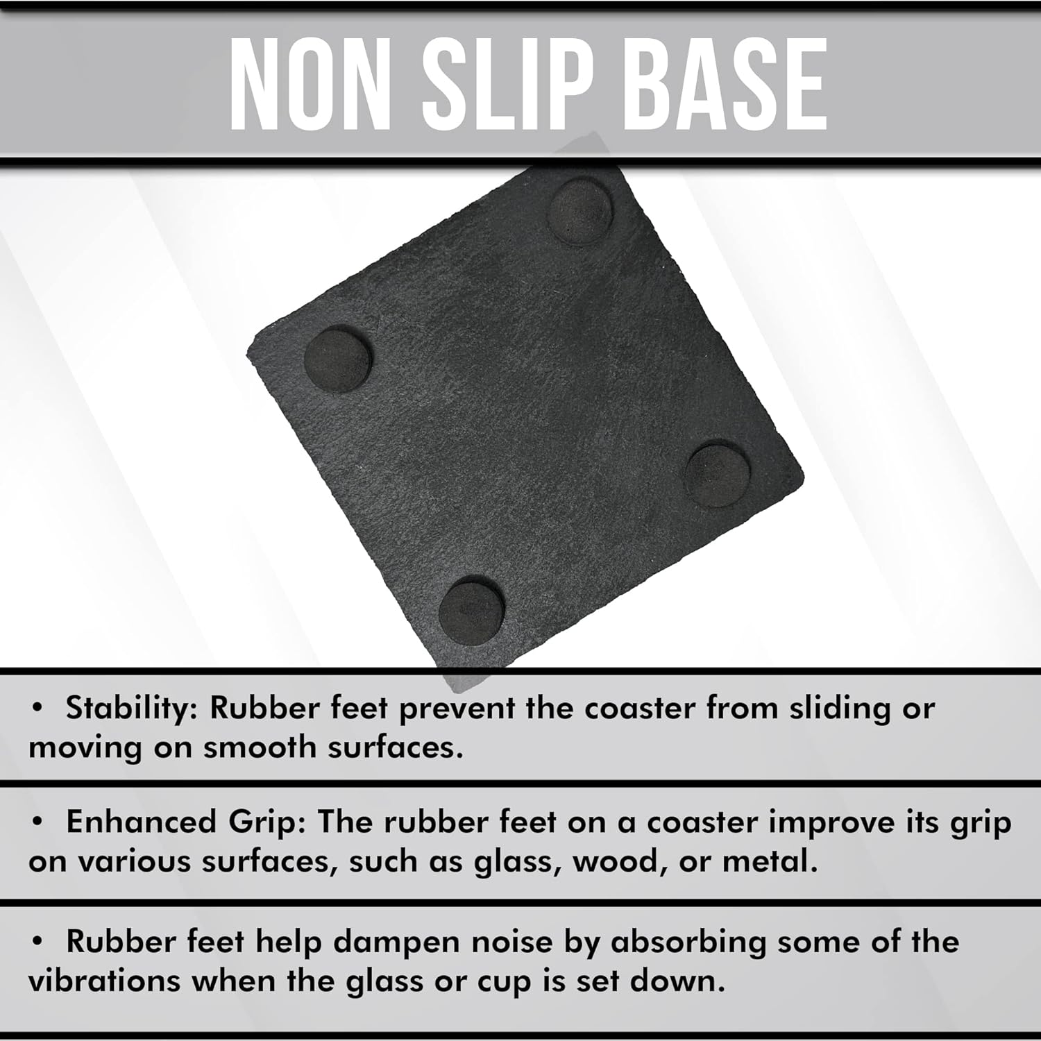Located on the underside of the coaster, the four rubber feet are strategically placed to provide stability, protection, and convenience. Crafted from high-quality, non-slip rubber material, these feet are designed to create a reliable grip on various surfaces, ensuring your coaster stays securely in place.
