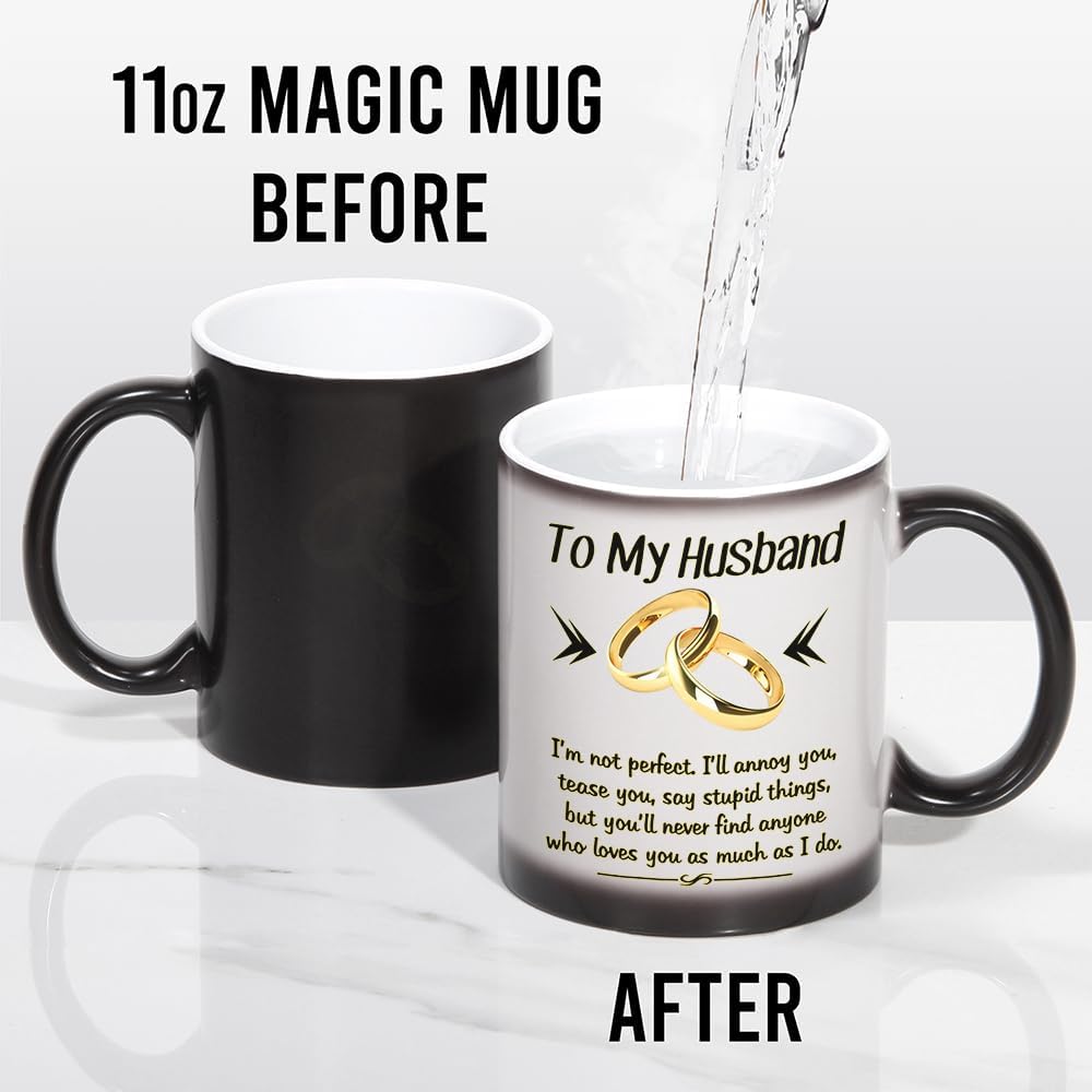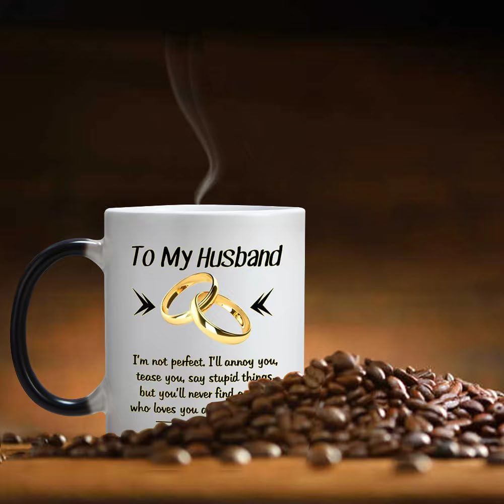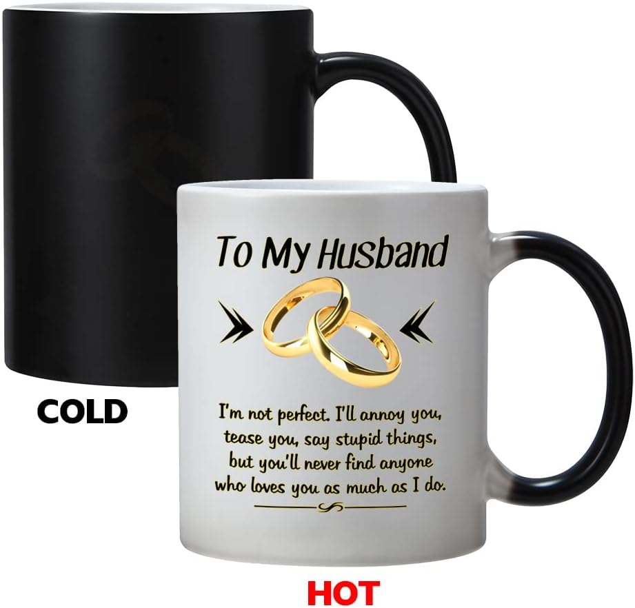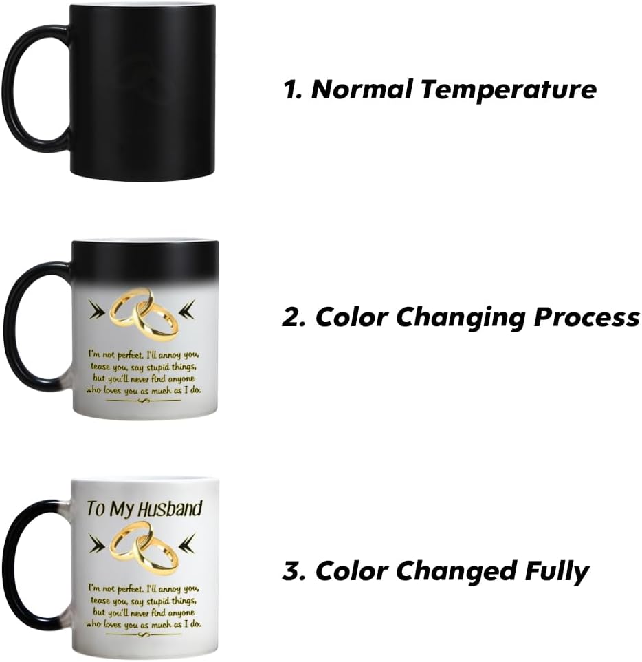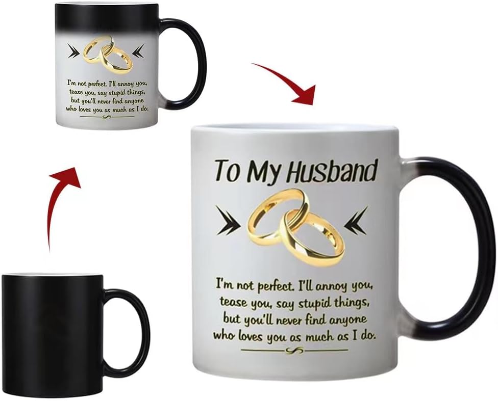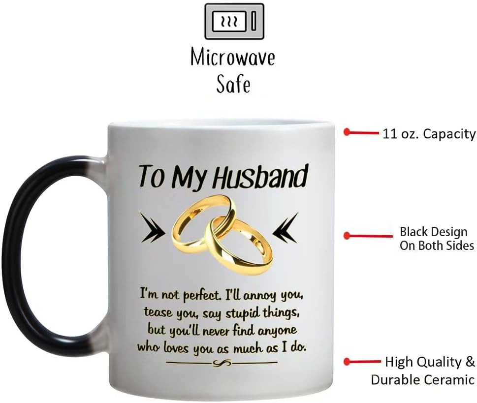 Design: To My husband,I`m not perfect,I`ll annoy you,tease you,say stupid things,but you`ll never find anyone who loves you as much as I doHeat Changing Gold-and-Black design makes this mug more NovetlyDesign is on both sides of the cupAll designs are lead free.High quality ceramicMicrowave safeGreat for hot drinksComfortable, C-handle11 ounce capacityIndividually packaged in a white box