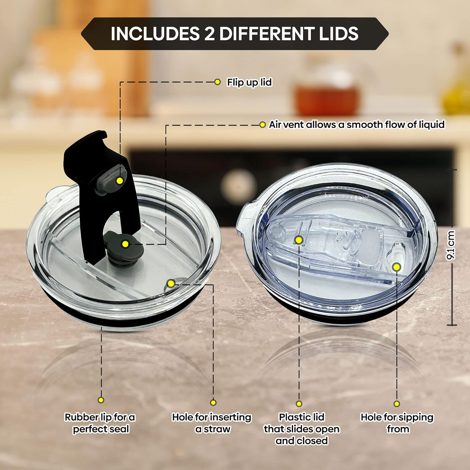 The first lid features a convenient flip top, allowing you to easily access your beverage with a simple flip of the lid. This design provides quick and effortless sipping.