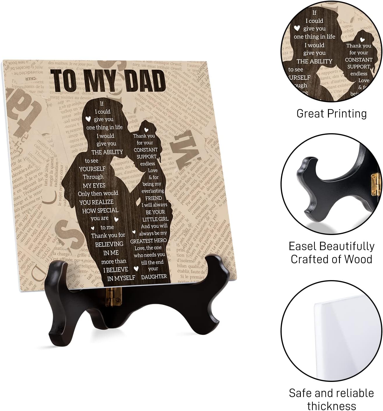💗【Presents for Dad Exquisite Design】- The 14*15*0.5cm square plaque with natural looking broken edges, comes with 17*12*1cm and 180° opening and closing wooden stand, painted black with gold latches, solidly and securely holding the tile, easy displaying anywhere and it will last much longer than flowers.To my dad engraved plaque – Presents for Dad with exquisite design.