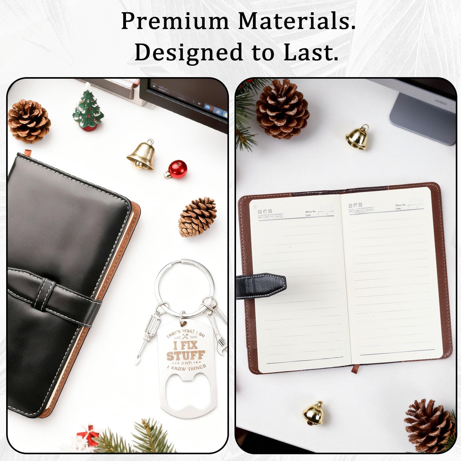 🕯️Scented Candle, Charcoal Soap & Leather Notebook Set – This gift box blends masculine style with a touch of self-care. The candle’s warm scent creates a cozy atmosphere after a busy day, while the bamboo charcoal soap gently cleans and refreshes his skin. The A6 black leather notebook is perfect for jotting down repair ideas, to-do lists, or personal notes. These thoughtful details transform an ordinary gift into a meaningful experience, combining humor, relaxation, and practicality all in one