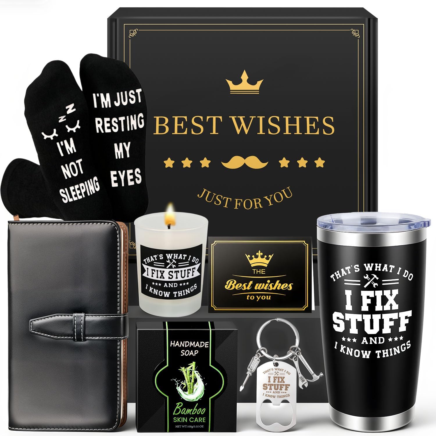 🧰Unique Repair-Themed Gift Set for Men – Looking for a creative gift that truly fits his personality? This all-in-one repair-themed gift box is designed for men who love fixing, building, and solving problems. Inside, he’ll find a stainless-steel mug with the quote “That’s What I Do, I Fix Stuff and I Know Things”, a scented candle, a notebook, and other fun accessories. Whether he’s a handyman, mechanic, engineer, or DIY lover, this set will make him feel appreciated and understood — equal parts fun, useful, and heartfelt