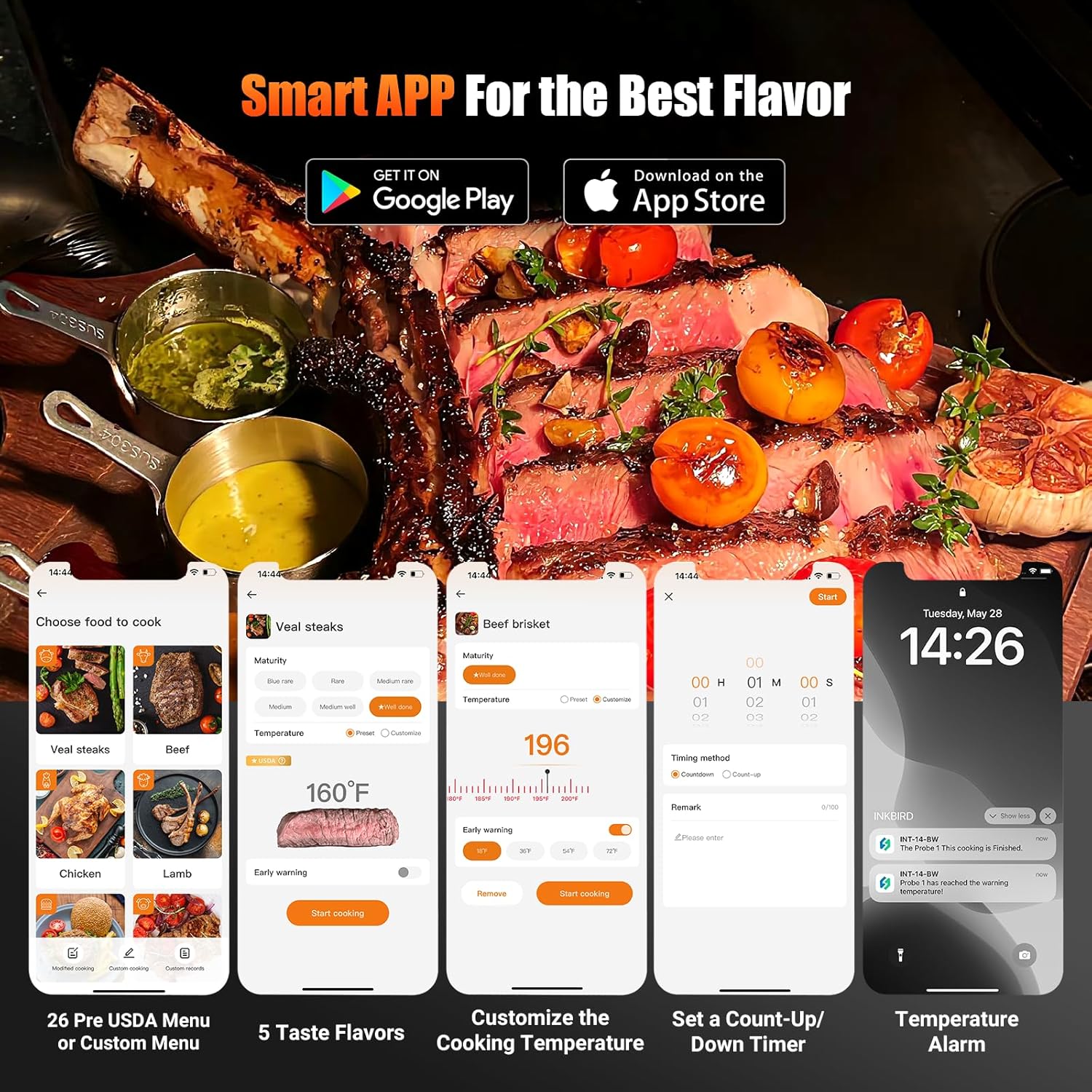 Inkbird App Smart Control with 26 Pre USDA Menu or Custom Menu and 5 Taste Flavors and High Alarm.Download INKBIRD app on iOS OR Android system to show your cooking skills. Support high temperature alerts, time alerts,graph tracking progress,will alarm you when temperature or timer reaches. The Inbkird fast read wireless meat thermometer help you create five-star meals for BBQ, grill, smoker, or oven.