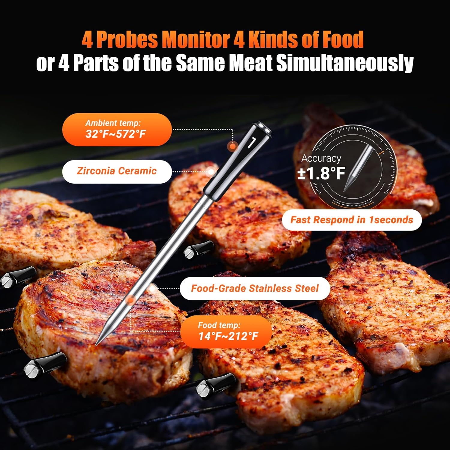 Precise Temperature Control of Remote Range Food Thermometer with ±1℃/±1.8℉ Accuracy and -12.6℉~+12.6℉ Calibation.Each probe is equipped with 2 temperature sensors, which are installed at the head and tail ends to detect the internal food temperature and cooking environment temperature at the same time. Food temperature support range: -10~100℃/14~212℉, ambient temperature support range: 0~300℃/32~572℉.Perfectly grill the lamb/steak/pork chop/roasted chicken with aroma and tenderness on the outside, so that everyone will be satisfied with the food
