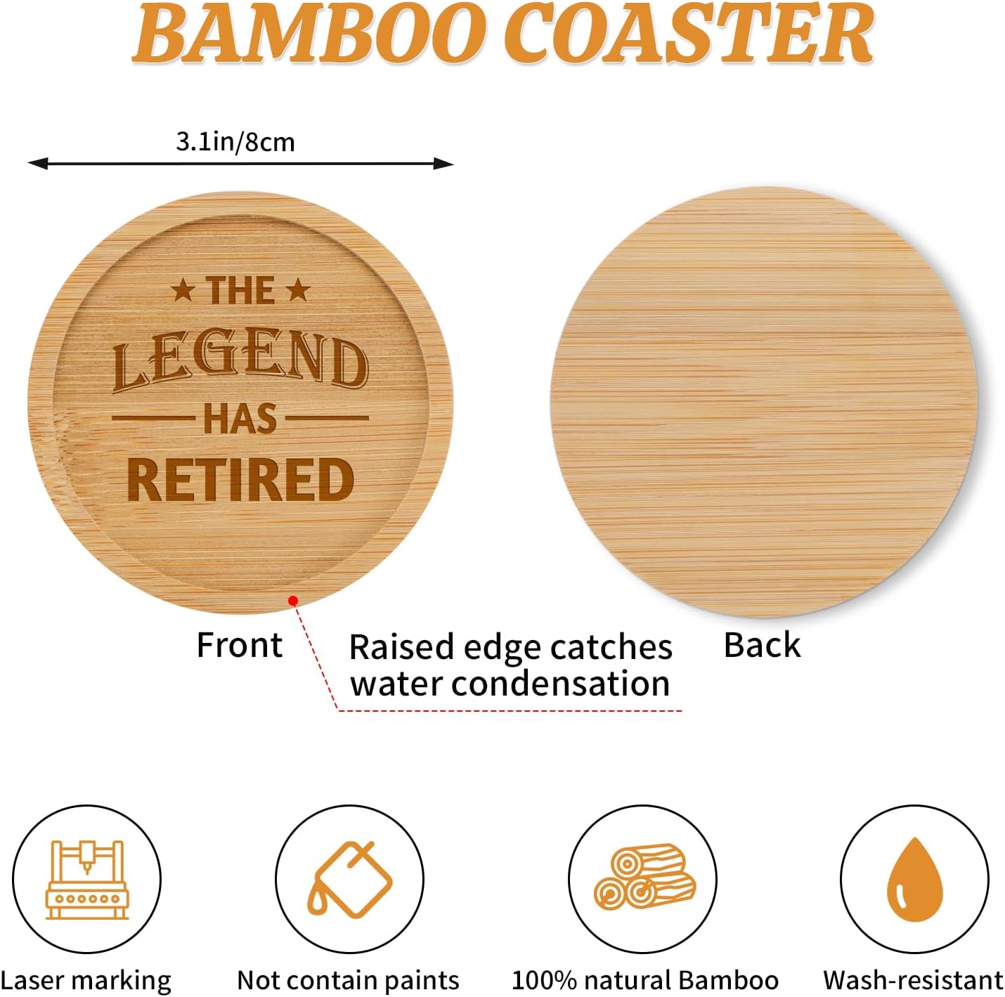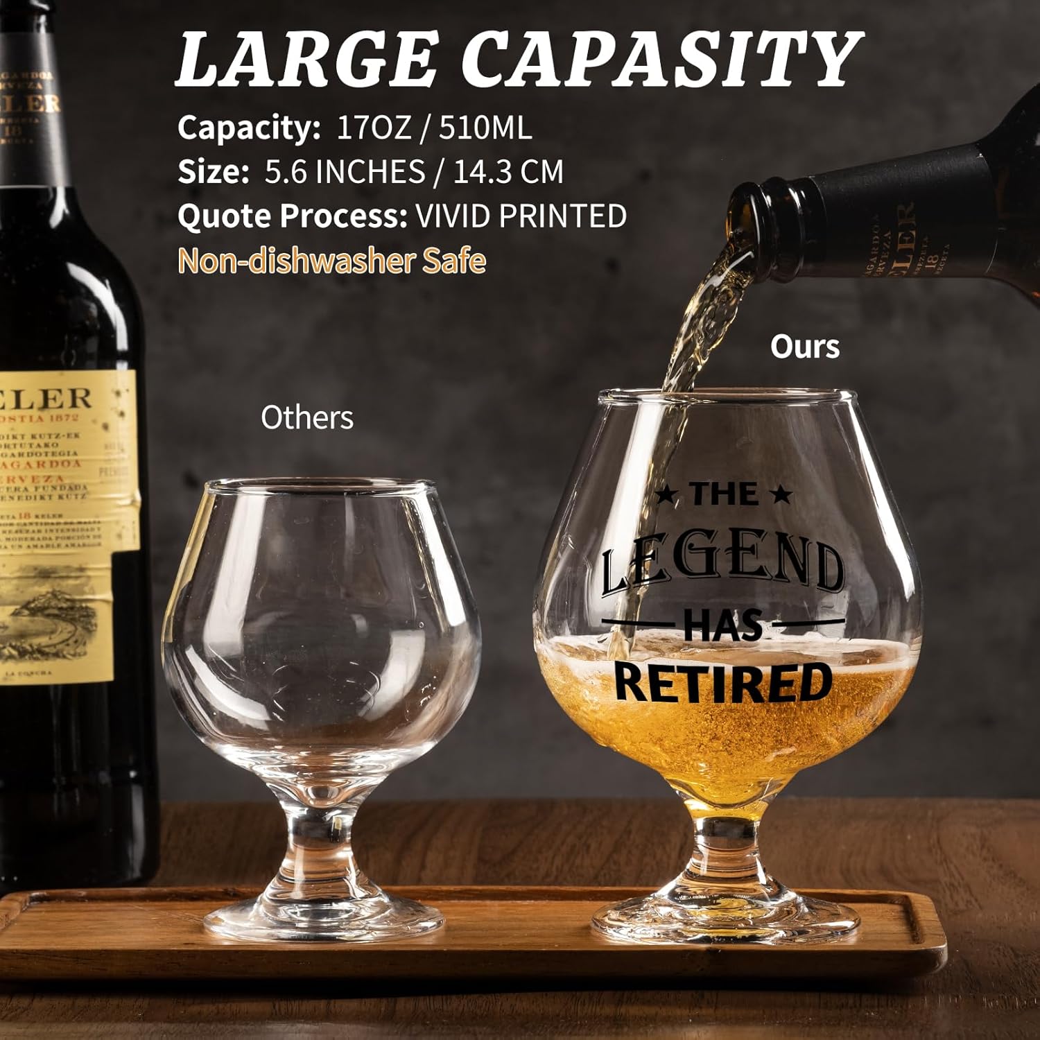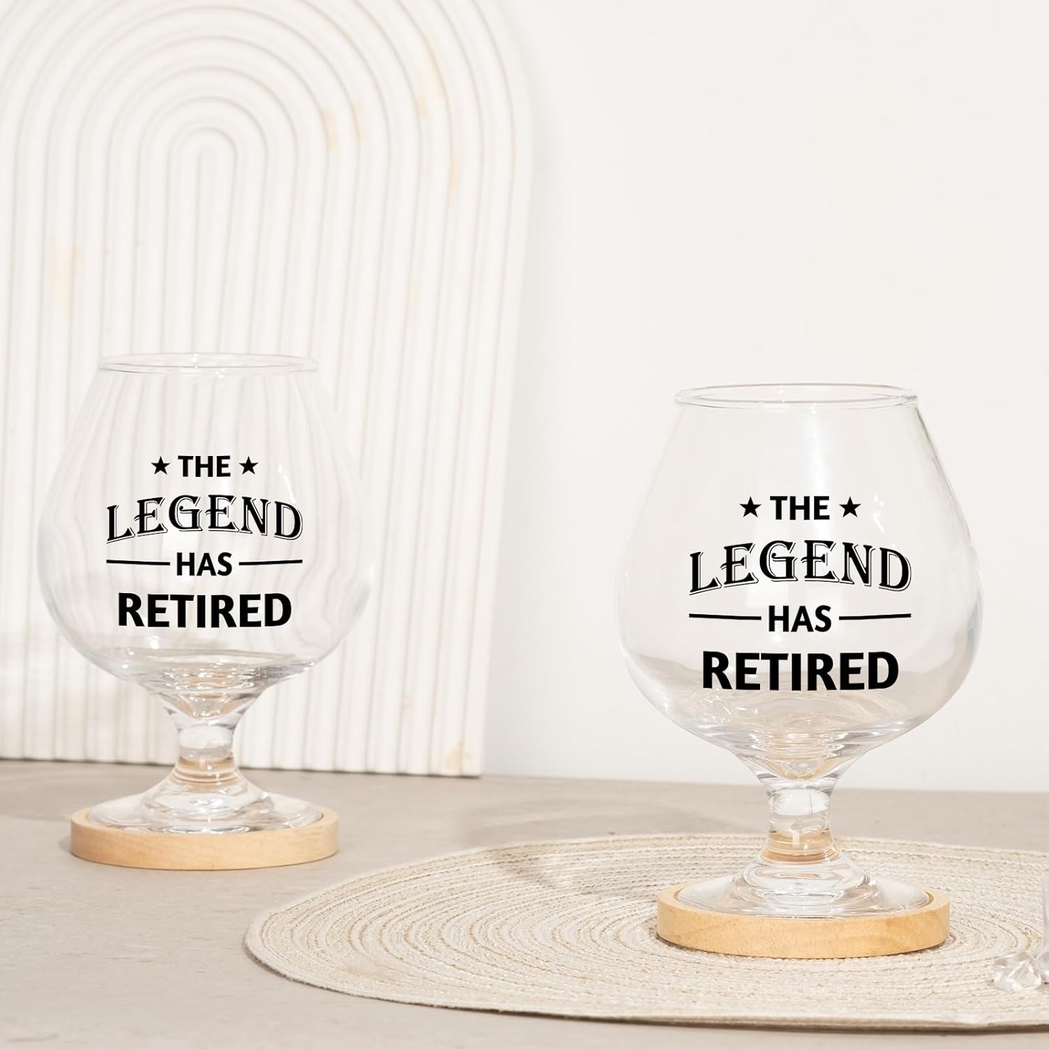NOVEL BEER GLASS: Celebrate the feats of a legend with “THE LEGEND HAS RETIRED” emblazoned on each beer glass and coaster. He will be reminded of his feats and you every time he uses this glass, and you will become as memorable as his feats.