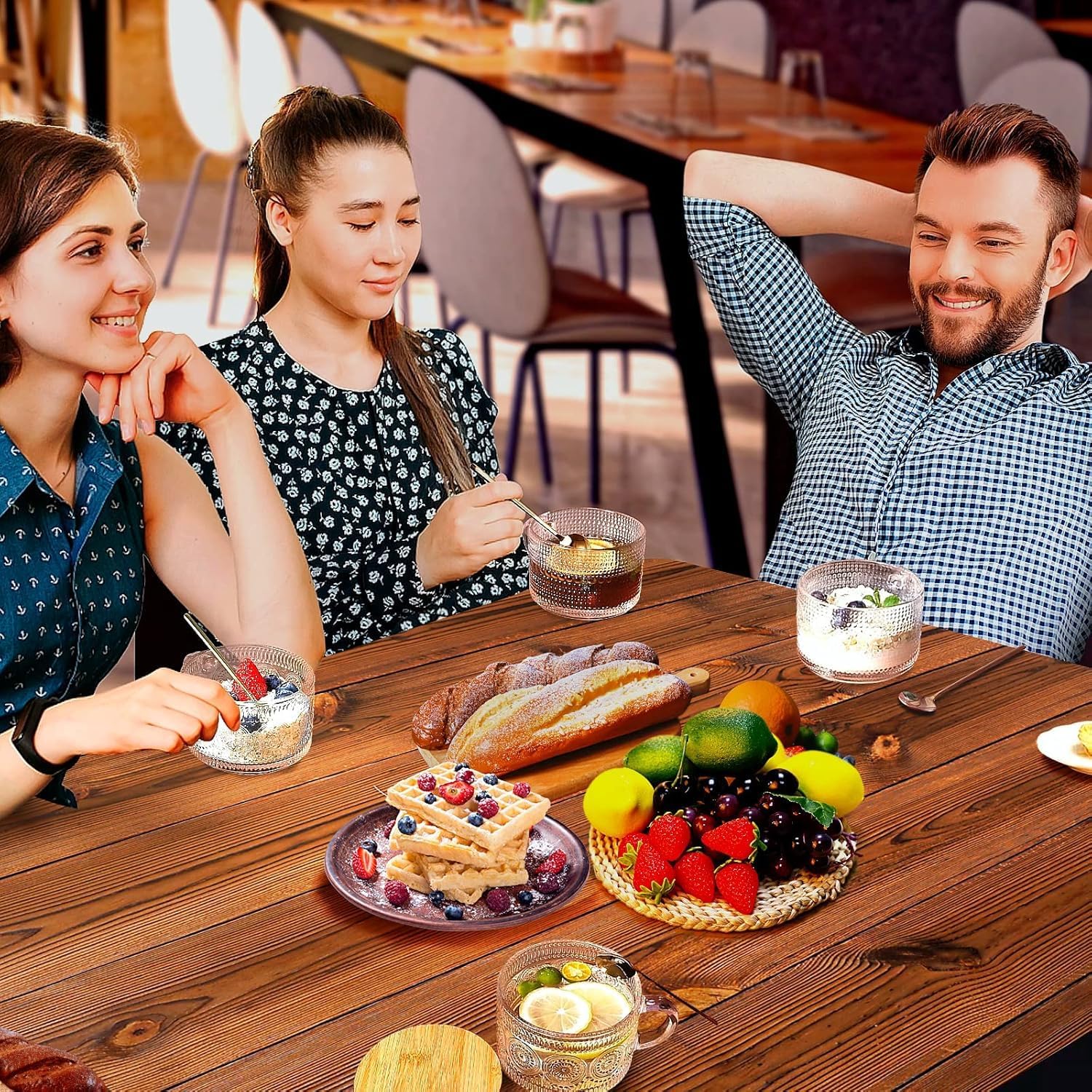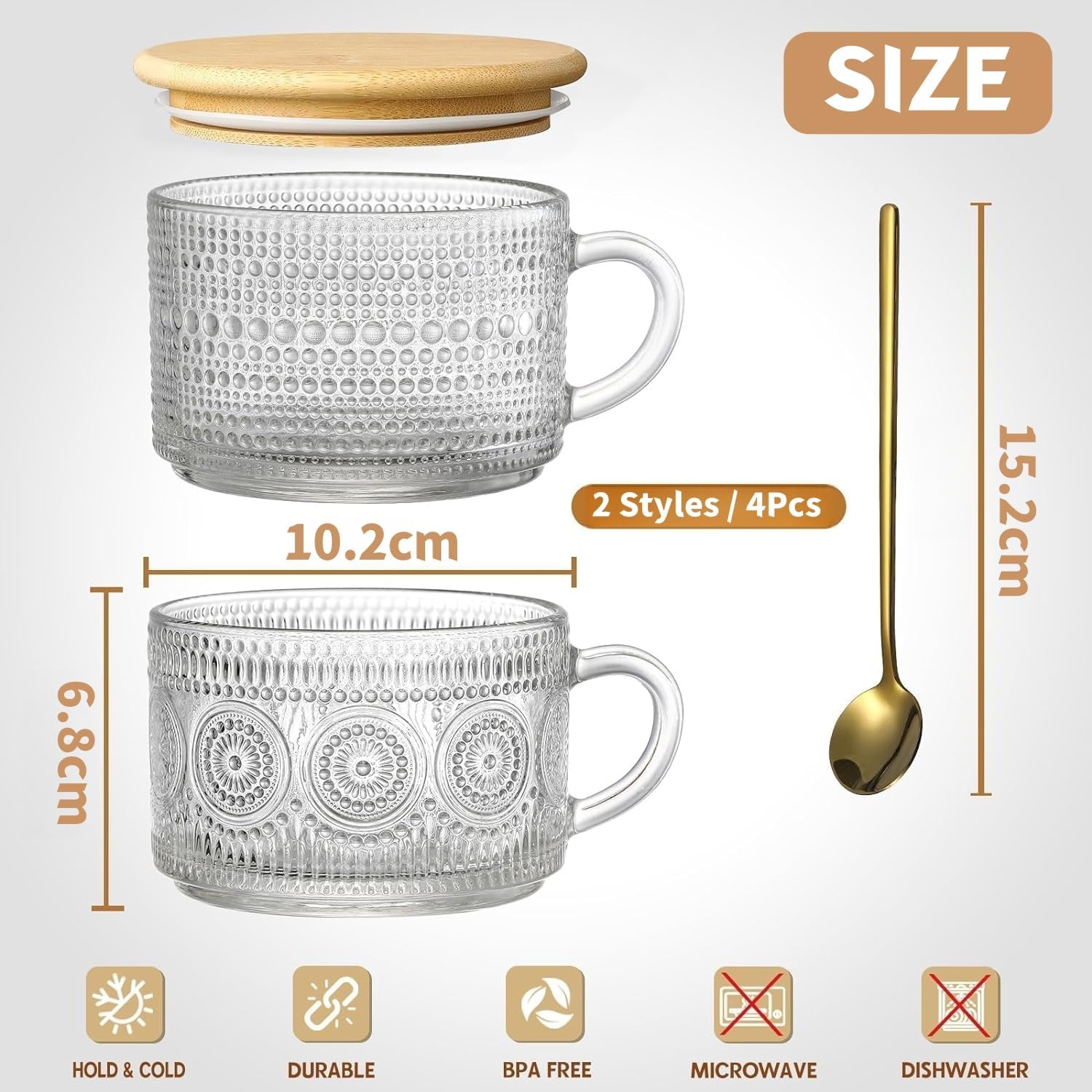 [Size] Capacity: 14oz /420ml, diameter: 10.2cm, height: 6.8cm, enough to hold a lot of cappuccino, latte, yogurt, ice cream, milk, overnight oats and desserts etc, and comes with 4pcs gold stainless steel spoons for scooping foods