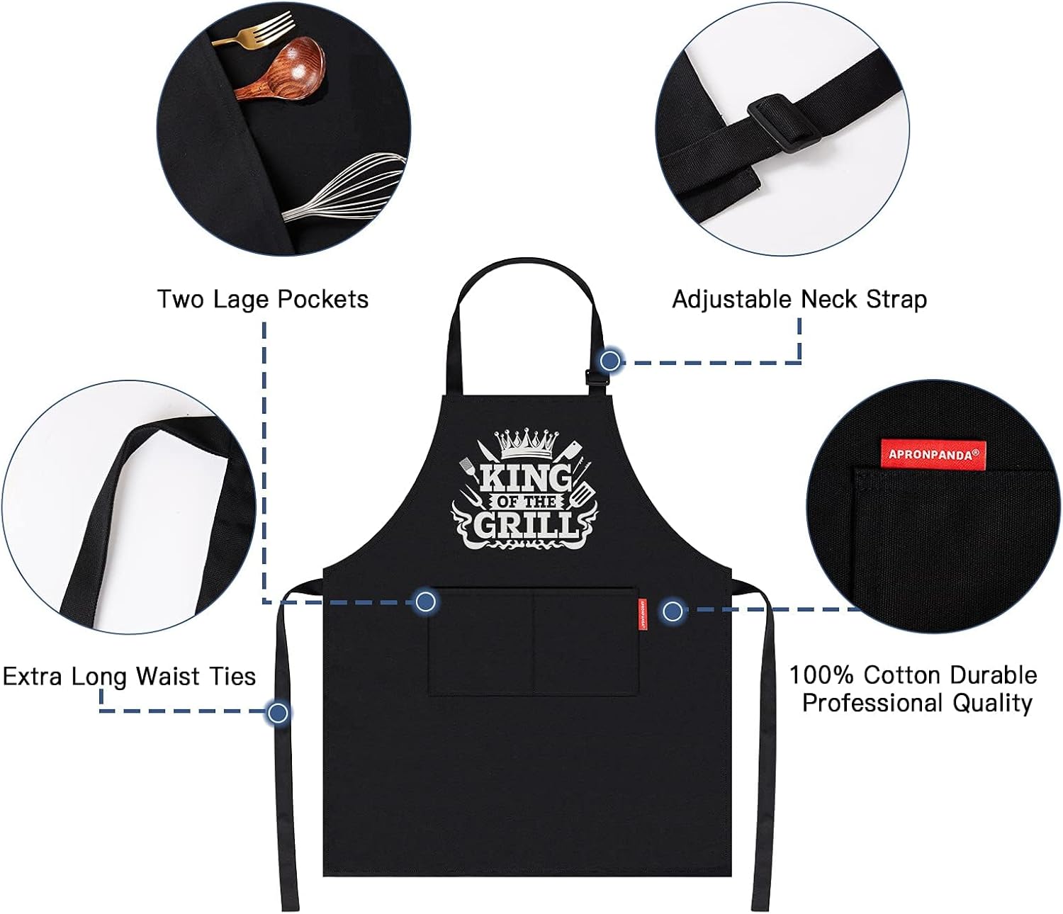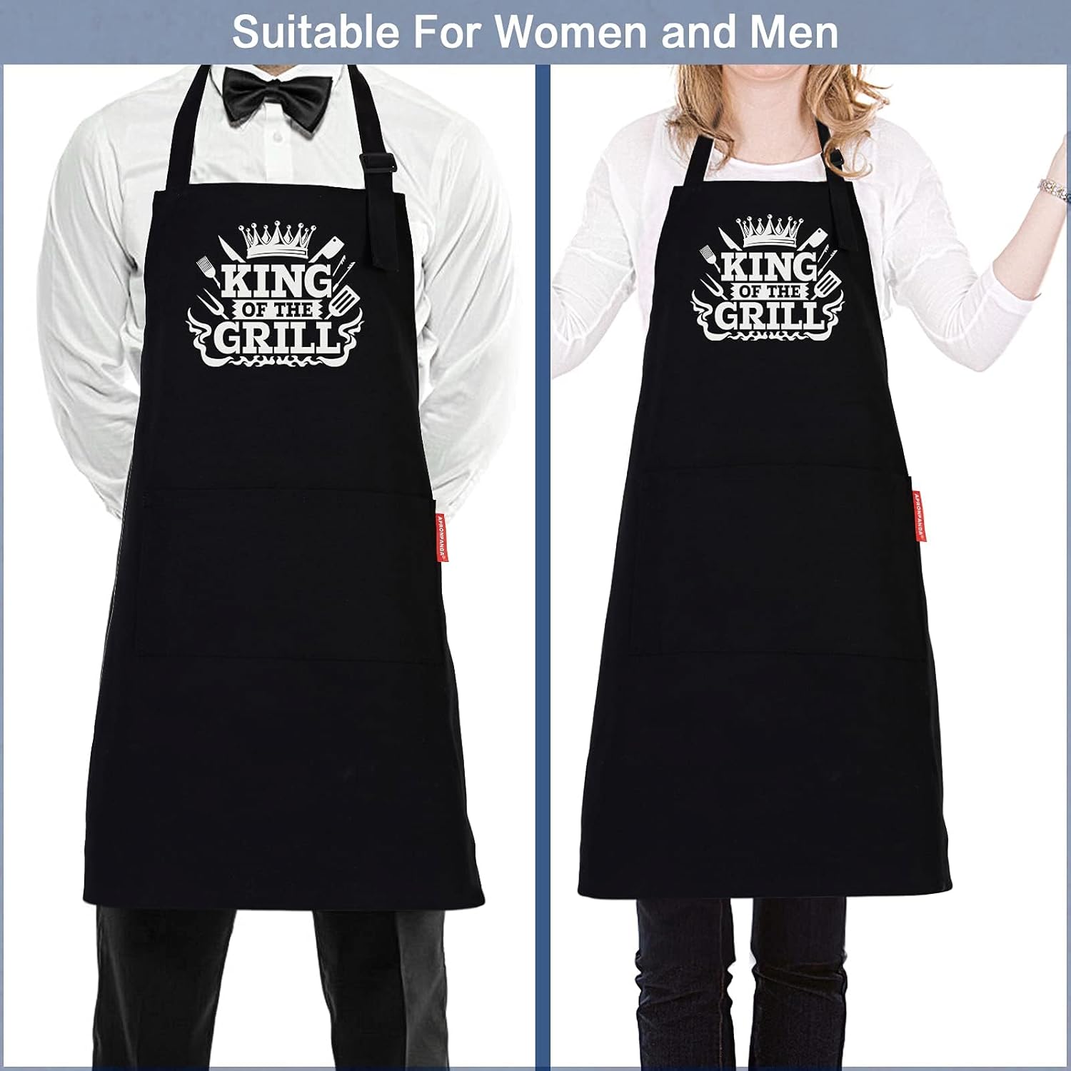 The high-quality thick 100% cotton protects clothes from splashing oil and allows our aprons to be used for years to come.Our screen printing process ensures that it will not fade, chip, or peel when washed.The apron has adjustable 40″ long waist ties and neckties, one size fits most people.Two useful pockets make it easy to store tongs, meat thermometers, etc.