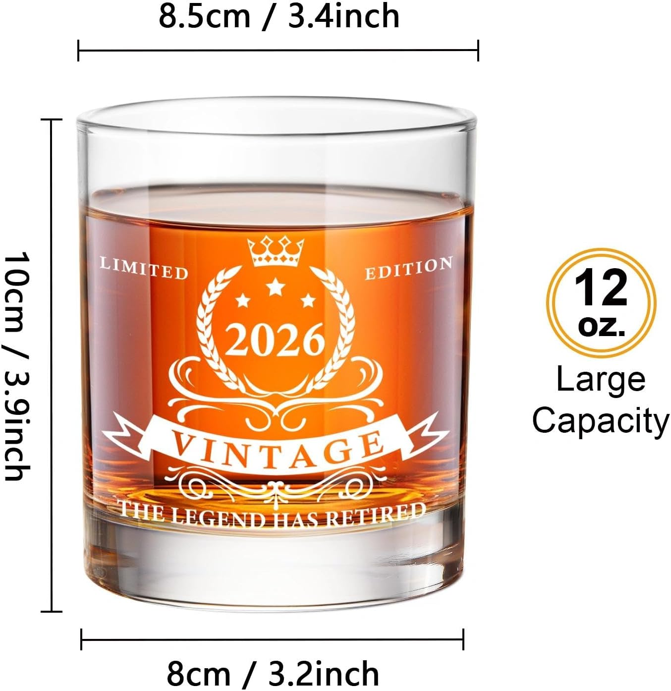 【Premium Prints and Whiskey Glass】2026 whiskey glass 12 oz with words “LIMITED EDITION-2026-VINTAGE-THE LEGEND HAS RETIRED” will never fade or lose.Unlike others,the text is printed on the glass appearance which is easy to wash out.To maintain words bright,it is better to wash by hands.2026 whisky glass is made of lead free crystal and features with thick side and solid base design.Large capacity is great for your favourite drinks. Happy 2026 retirement gifts ideas for men.