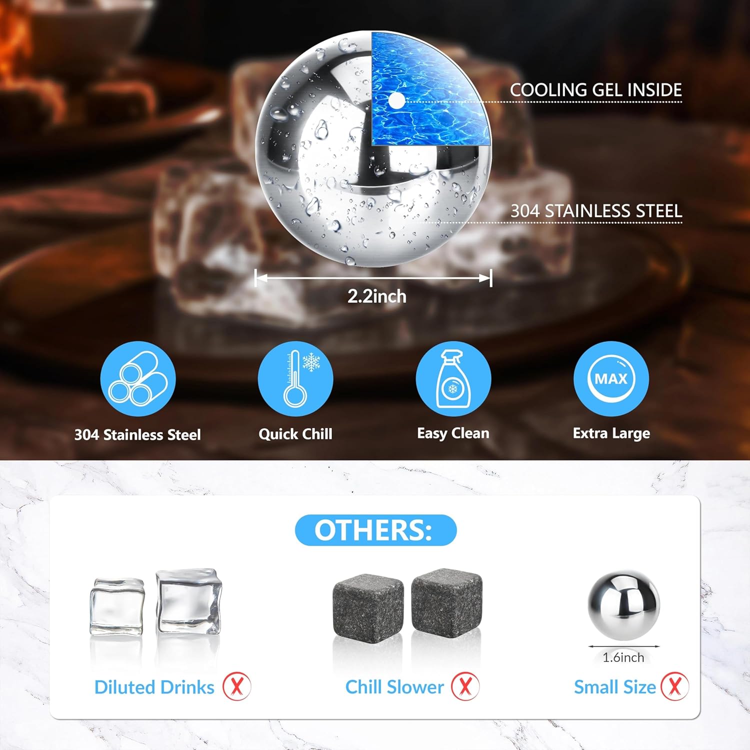 【Better Drinks Tasting Experience with Extra Large Whiskey Ball】2.2 inch XL stainless steel whiskey ball can cool down your drinks faster than small size ball or traditional ice cube.Made of food grade stainless steel and safe to use everyday.It is durable,reusable and easy to wash.The smooth surface keep your drink pure and full flavour without melted ice.Happy retirement gifts for men.
