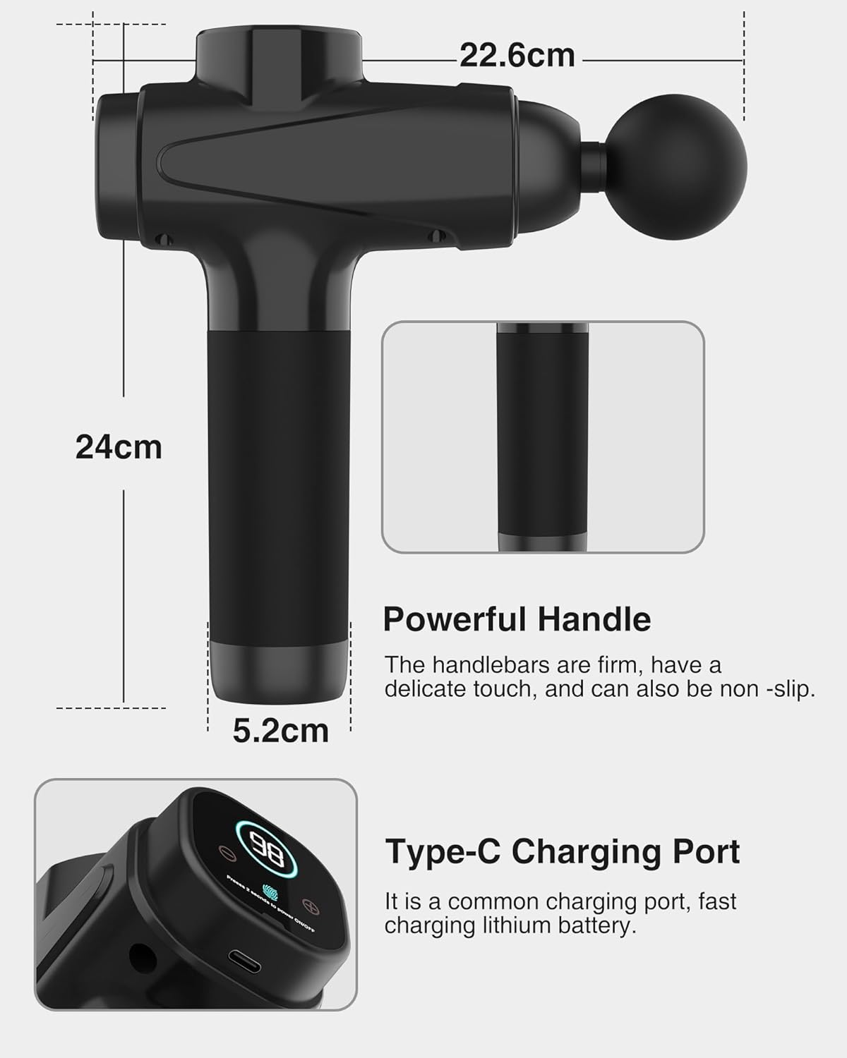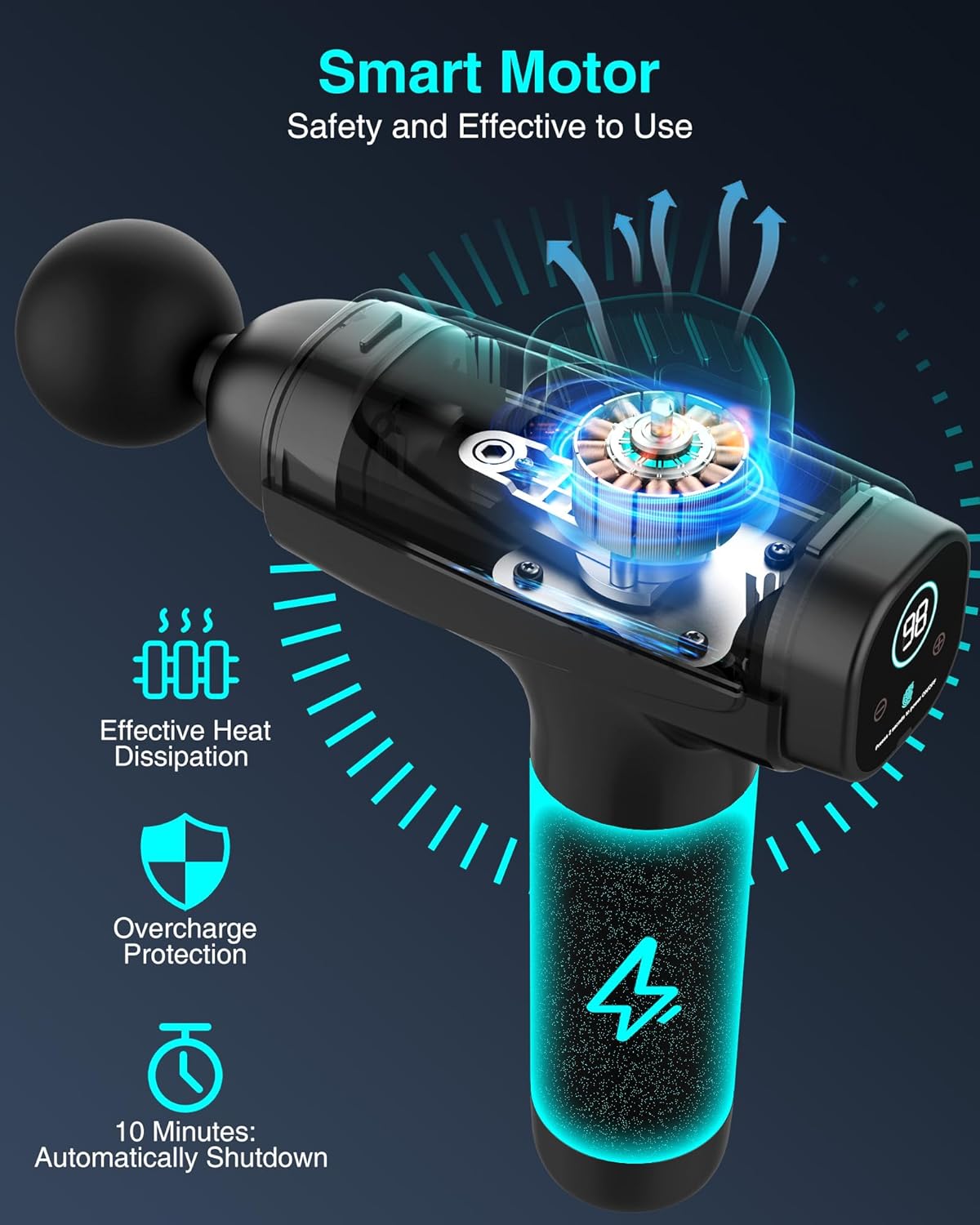 LCD Touch Screen & Long Working Time: The gun massage use LCD touch display control, you can intuitively read the remaining power and speed level. Equipped with 2500 mAh high-quality rechargeable lithium battery, it can be charged for 4-6 hours, and the working time can last up to 6 hours. The massager gun use high-quality motors with super heat dissipation function to prevent overheating to extend battery life